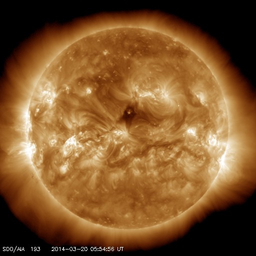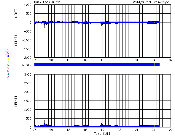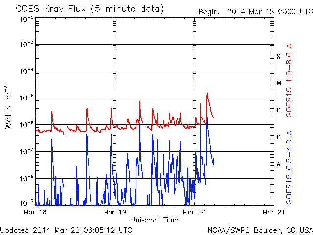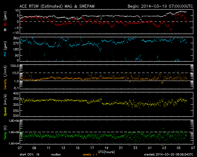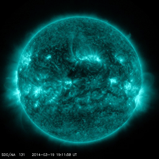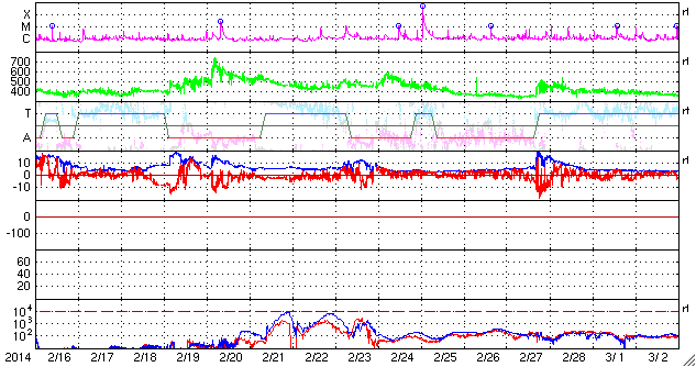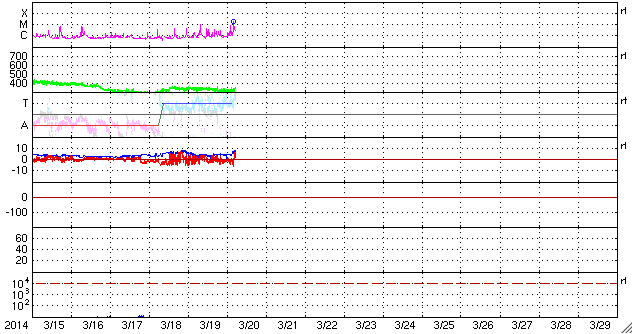 2014/ 3/20 15:09 更新 M1.7の中規模フレアが発生しました。太陽風は低速で、磁気圏も穏やかです。 担当 篠原 太陽の東端(左端)から、2014黒点群が姿を現し、 活発にフレアを起こしています。 昨日以降、C1からC3の小規模フレアを6回起こし、 今朝にはC8.3と大きいCクラスフレアを起こしています。 昨日のニュースで注目していた2010群は、 昨日の午後に、C9.9とMクラス寸前のフレアや、 C4.2のフレアを起こしましたが、 今日に入ってからは静かになっていました。 そして、先ほど、20日13時(世界時20日4時)に、 M1.7の中規模フレアが発生しました。 NOAA/SWPCの報告では2010群の発生となっています。 しかし、SDO衛星AIA131の動画を見ると、 ほとんど同時に2014群でも明るい輝きが発生しています。 この2つの黒点群の活動には、今後も注目して下さい。 太陽風は、330km/秒と低速の状態で安定しています。 磁場強度は、5nTと平均的な値が続いていましたが、 昼頃から8nTに少し高まっています。 一時的な変化ではないかと思いますが、 もうしばらく様子を見る必要があります。 磁気圏は概ね静穏です。 SDO衛星AIA193では、 太陽の中心に小さいコロナホールが見えています。 規模は小さいですが、中央部に位置しているので、 3日後くらいに弱い影響が見られるかもしれません。 学校に戻ってみると、桜の花が咲き始めていました。 これから毎日、花の開いていく様子が楽しみです。 ![]() SDO衛星AIA131による、2014黒点群(左)と2010群(右)のフレア活動。 (c) SDO (NASA)、 (動画加工 : 宇宙天気ニュース) ![]() SDO衛星のAIA193カメラによる太陽コロナの様子 (c) SDO (NASA) ![]() SDO衛星による太陽の可視光写真。マウスの矢印を写真に重ねると、黒点番号付きの写真に切り替わります。 (c) SDO (NASA) ![]() GOES衛星の太陽X線データ (c) NOAA/SWPC ![]() ACEが観測した太陽風の磁場(1番上の枠、白線は全体の強度、赤線は南北成分) および、太陽風の密度(3番目の橙線)、速度(4番目の黄線) (c) NOAA/SWPC ![]() リアルタイムAE指数 下段のAEグラフの値が高くなると、オーロラ活動が活発化しています。 (c) 京都大学, NICT ![]() 27日の太陽周期に合わせたデータプロット 太陽が同じ面を地球に向けていた27日前の変化から、今後を予想することができます。 (c) 作図:宇宙天気ニュース