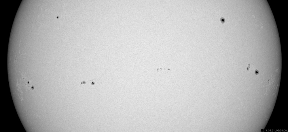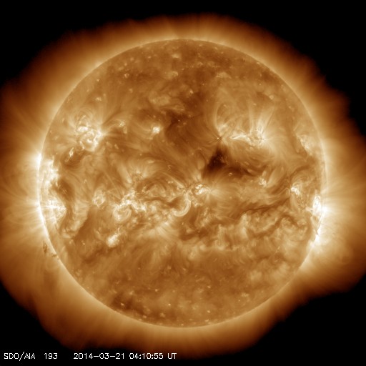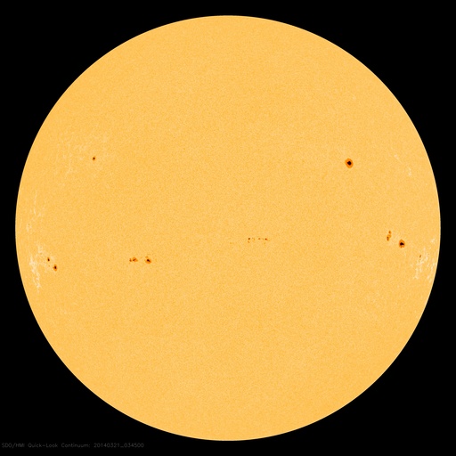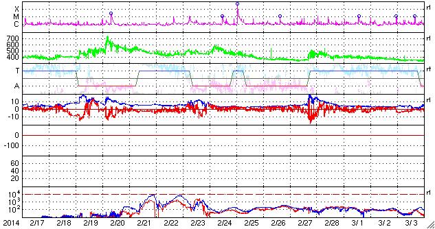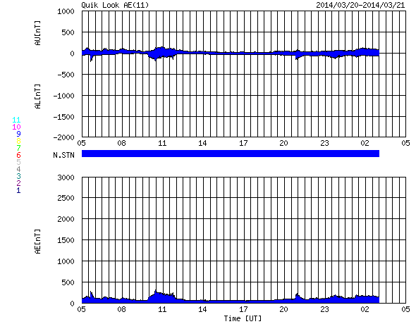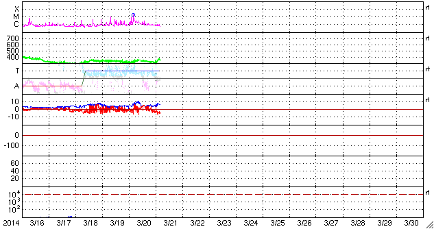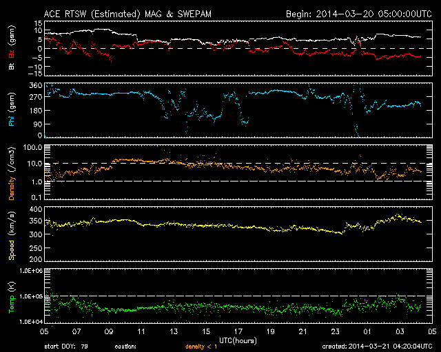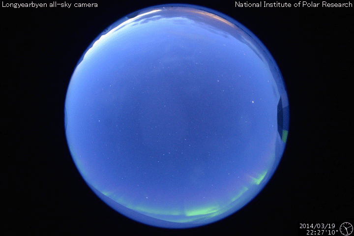 2014/ 3/21 13:20 更新 太陽風は低速で穏やかです。太陽のフレアも少なくなっています。 担当 篠原 日本時間で昨日の朝にあたる、 世界時19日22時半頃のオーロラの写真を、 ノルウェー・スバールバル島の全天カメラが撮影していました。 と言っても、下の方にちらちらと見える弱いオーロラです。 春分を迎えて、国立極地研究所のスバールバル島全天カメラは そろそろ撮影を終了しそうです。 一昨日のトロムソ同様、今期最後の写真掲載になるかもしれません。 太陽風の速度(ACEの図の黄色線)は、 330km/秒から350km/秒の幅で少しだけ変化していますが、 低速の状態は続いています。 昨日強まりかけていた磁場強度(白線)は、 昨日の夕方頃に10nTにまで上がりましたが、 すぐに下がり、再び5nTと平均的な状態で安定しています。 磁場の南北成分(赤線)は、 北を向いたり(プラス方向)、南を向いたり(マイナス方向) ゆっくりと変化しています。 磁気圏の活動度もこれに対応して、 AE指数は、小さい変化をしたり、 変化がなくなったりしています。 現在の磁場は南寄り(マイナス)になっているので、 カナダやアラスカのライブカメラで 弱いオーロラ活動が見られるかもしれません。 太陽は、昨日のM1.7以降は、2014群でC2.7、C2.9、C1.2と 小さいフレアが発生したくらいで、落ち着いています。 少し休んで再び活動を高めるということも良くあるので、 引き続き注目して下さい。 太陽の可視光写真では、 南半球側の右端から2011、2008、2010、2014と 4つの黒点群が一列に並んでいます。 黒点がにぎやかに見られるのも、 太陽の活動周期の極大ならではです。 フレアだけでなく、この様な光景にも注目して下さい。 ![]() ノルウェー・スバールバル島のLongyearbyenで全天カメラによって撮影されたオーロラ。 (c) 国立極地研究所、(動画加工 : 宇宙天気ニュース) ![]() 南半球に並ぶ、2011、2008、2010、2014黒点群(右から)。SDO衛星の可視光写真。 (c) SDO (NASA) ![]() SDO衛星のAIA193カメラによる太陽コロナの様子 (c) SDO (NASA) ![]() SDO衛星による太陽の可視光写真。マウスの矢印を写真に重ねると、黒点番号付きの写真に切り替わります。 (c) SDO (NASA) ![]() ACEが観測した太陽風の磁場(1番上の枠、白線は全体の強度、赤線は南北成分) および、太陽風の密度(3番目の橙線)、速度(4番目の黄線) (c) NOAA/SWPC ![]() リアルタイムAE指数 下段のAEグラフの値が高くなると、オーロラ活動が活発化しています。 (c) 京都大学, NICT ![]() 27日の太陽周期に合わせたデータプロット 太陽が同じ面を地球に向けていた27日前の変化から、今後を予想することができます。 (c) 作図:宇宙天気ニュース