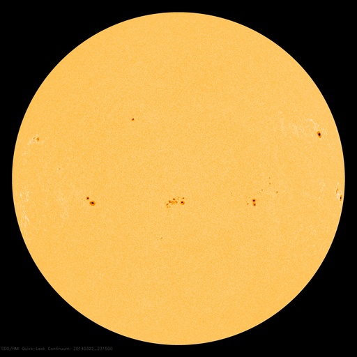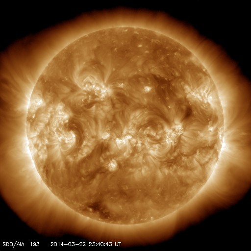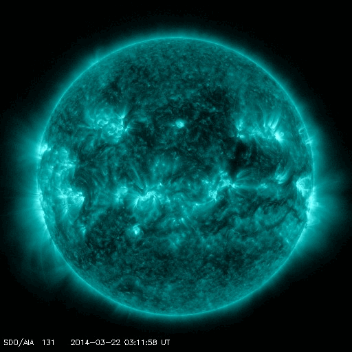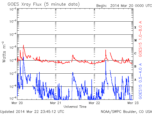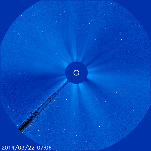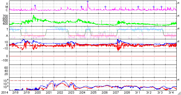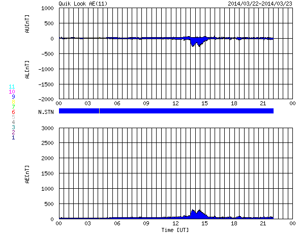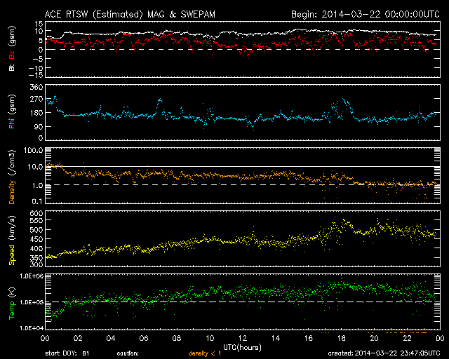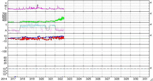 2014/ 3/23 08:47 更新 太陽風は500km/秒の高速風になっています。磁気圏は穏やかです。 担当 篠原 昨日の午後、22日16時(世界時22日7時)に、 太陽の西端の2011黒点群で M1.1の中規模フレアが発生しました。 続いて、22日18時(世界時22日9時)に、 隣の2005黒点群でC4.8の小規模フレアが発生しています。 規模は2011群のフレアの方が大きいですが、 2005群で起きたフレアは、CMEの発生を伴っています。 SOHO衛星LASCO C3の動画を見ると、 右上に向かって白いガスが噴き出しています。 その前に右横に向かって噴き出すCMEも起きていますが、 これは裏側の現象です。 CMEは斜め方向に飛び出しているので、 地球への影響は見られないか、 到来しても小さい変化でしょう。 太陽風は、昨日のニュース以降更に速度が上がり、 今日未明に500km/秒に達して高速風になっています。 それに伴って磁場強度は10nTから7nTに少し下がっていますが、 依然やや強まった状態です。 磁気圏への影響を左右する太陽風磁場の南北成分は、 ほとんどの時間帯で北寄りに推移しています。 一時的に0nTに近づいた時に、 AE指数300nTの小規模のオーロラ活動が起きています。 今回の高速風は、SDO衛星AIA193で西側に見えていた コロナホールの影響かもしれません。 コロナホールの規模は小さかったので、 高速風は短い期間で終わるのではないでしょうか。