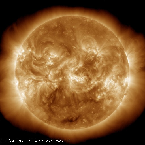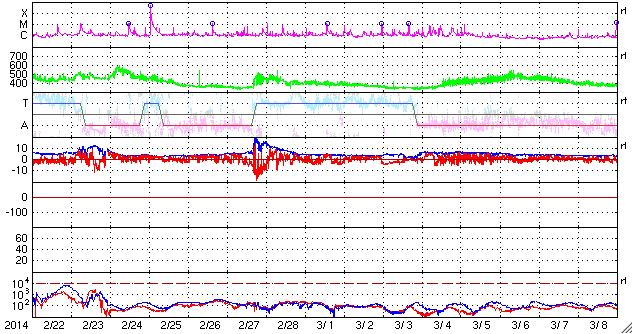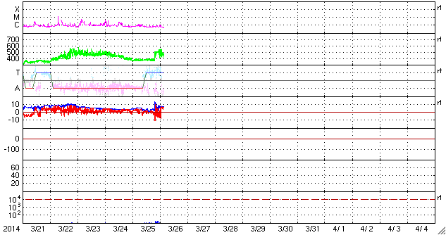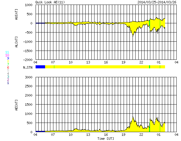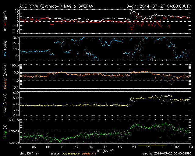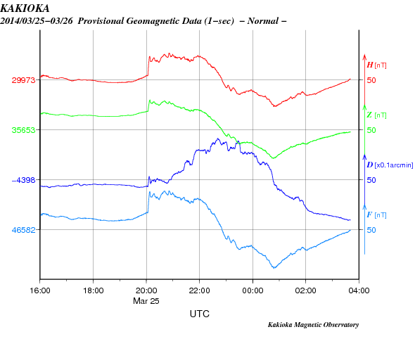 2014/ 3/26 12:45 更新 今朝、太陽風の乱れが到来しました。活発なオーロラも発生しています。 担当 篠原 ACE衛星の観測によると、 今朝、26日4時半(世界時25日19時半)に、 太陽風の乱れが到来し、 速度は380km/秒から480km/秒に、 磁場強度は3nTから14nTに、それぞれ高まっています。 太陽風の強まりは、 30分後の26日5時(世界時25日20時)に地球に到達しました。 気象庁地磁気観測所の茨城県柿岡の磁場データでは、 20nTほどの急な強まりが観測されています(1枚目の図)。 22日か23日のCMEによる太陽風の乱れだと考えられます。 23日のCMEの可能性が高そうですが、少し到来が早い感じもします。 一方、22日のCMEであれば、 この後に23日のCMEの乱れが到来する可能性があります。 この後の太陽風の変化にも注目して下さい。 太陽風擾乱の到来以降、 磁場の南北成分は南向きに大きく振れました。 短時間ですが最大で-10nTに振れ、 その後も-5nTくらいの変化が数時間続いています。 この影響で磁気圏の活動が強まり、 AE指数は800nTくらいの中規模の変動が発生しています。 世界時25日23時頃のオーロラの様子を、 ノルウェー・トロムソの全天カメラの動画で紹介します。 空全体をオーロラの見事な輝きが覆っています。 太陽風磁場の南北成分は、26日10時(世界時26日1時)以降は、 北向きに振れて、そのまま安定しています。 このため、オーロラの活動も以降は弱まりそうです。 カナダ、アラスカのライブカメラに期待していたのですが、 現状のままでは、活発な変動はなさそうです。 太陽風の乱れは、この後は次第に弱まっていくでしょう。 明日には穏やかな状態に戻っているのではないかと思います。 太陽は、C1程度の小さいフレアが起きている程度で、 全体としては穏やかです。 2010黒点群や2014群は縮小の傾向にあるようです。 ![]() 茨城県柿岡の地磁気観測所で観測された、太陽風の急な強まりによる磁場変化。 (c) 気象庁地磁気観測所 ![]() ノルウェー・トロムソの全天カメラにより撮影された、活発なオーロラ。 (c) 国立極地研究所、(動画加工 : 宇宙天気ニュース) ![]() SDO衛星のAIA193カメラによる太陽コロナの様子 (c) SDO (NASA) ![]() SDO衛星による太陽の可視光写真。マウスの矢印を写真に重ねると、黒点番号付きの写真に切り替わります。 (c) SDO (NASA) ![]() ACEが観測した太陽風の磁場(1番上の枠、白線は全体の強度、赤線は南北成分) および、太陽風の密度(3番目の橙線)、速度(4番目の黄線) (c) NOAA/SWPC ![]() リアルタイムAE指数 下段のAEグラフの値が高くなると、オーロラ活動が活発化しています。 (c) 京都大学, NICT ![]() 27日の太陽周期に合わせたデータプロット 太陽が同じ面を地球に向けていた27日前の変化から、今後を予想することができます。 (c) 作図:宇宙天気ニュース