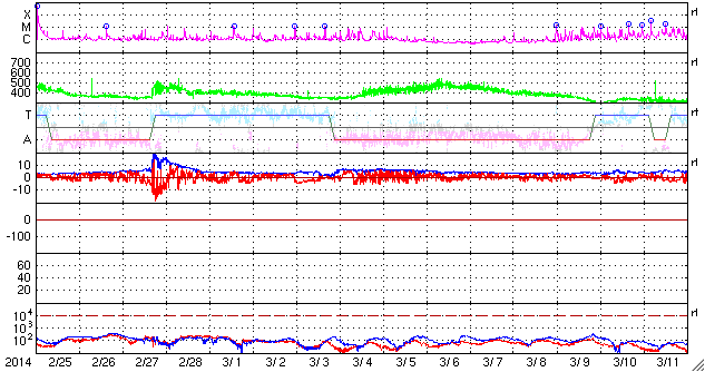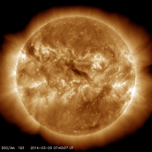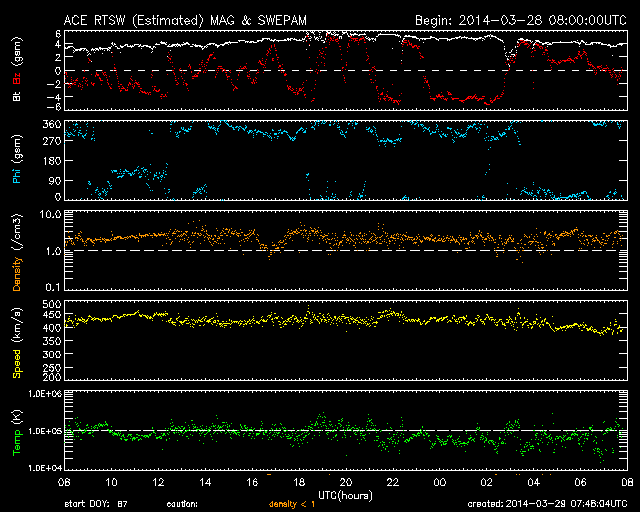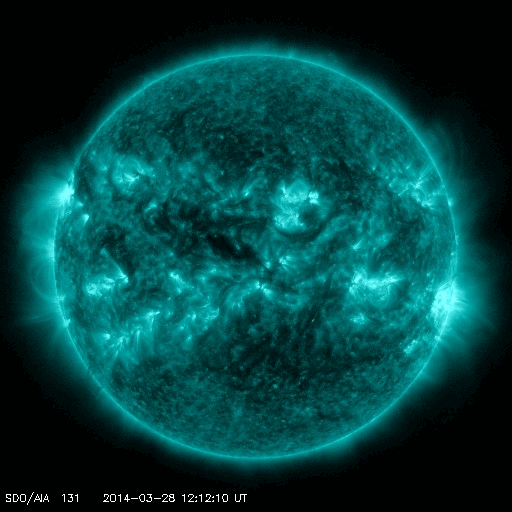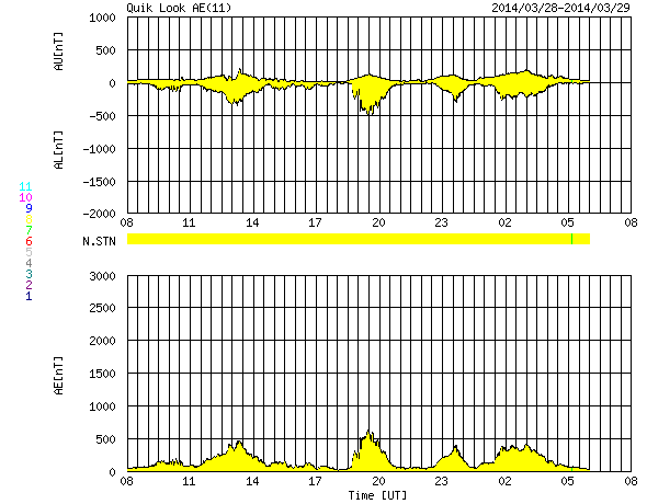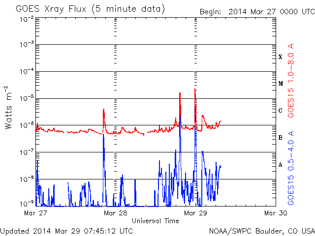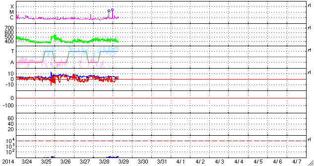 2014/ 3/29 16:48 更新 M2の中規模フレアが2回発生しました。磁気圏はやや活動的です。 担当 篠原 今朝、太陽の中心からやや右上の2017黒点群で、 中規模フレアが2回発生しました。 29日4時(世界時28日19時)のM2.0と、 29日9時(世界時29日0時)のM2.6です。 SDO衛星AIA131によるフレアの動画を掲載します。 短時間の強い輝きが2回発生しています。 動画には、左上で発生したC2.4の小規模フレアも 続いて写っています。 2017群の今後の活動に注目してください。 太陽風は、400〜450km/秒とやや高めの速度が続いています。 磁場強度は、4〜5nTと平均的です。 磁場の南北成分は、南に北にと頻繁に変化しています。 このため、磁気圏の活動も高まり、 AE指数のグラフでは500nTの変動が数時間おきに4回ほど発生しています。 極域ではきれいなオーロラを眺められたかもしれません。 磁場のこの傾向が続けば、 引き続きオーロラの活動も期待できます。 SDO衛星AIA193の太陽コロナ写真には、 コロナホールは特に見られません。 太陽風は基本的には穏やかに推移すると思われます。 今日は用件が重なったため、 更新がすっかり遅くなってしまいました。 申し訳ありません。