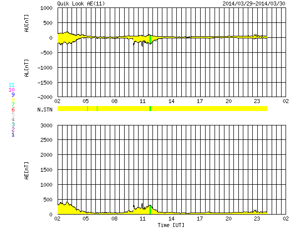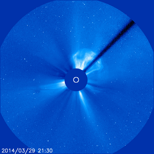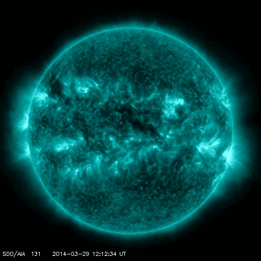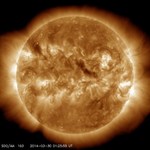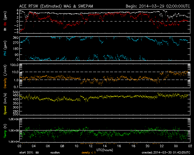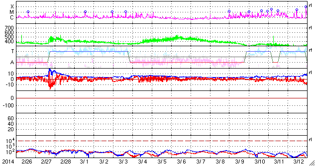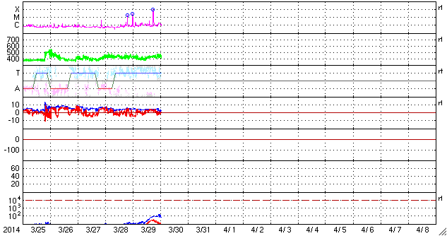 2014/ 3/30 10:42 更新 2017黒点群でX1.0の大規模フレアが発生しました。 担当 篠原 昨日、中規模フレアの発生で注目していた2017黒点群で、 深夜、30日2時半(世界時29日17時半)に X1.0の大規模フレアが発生しました。 SDO衛星AIA131と193による動画を掲載します。 太陽の中央右上で明るい輝きが発生しています。 AIA193の写真(茶色)では、 ガスの噴き出しが広がっている様子も見えます。 SOHO衛星LASCO C3の動画は、 フレア発生直後の写真がないため、 発生タイミングが分かりにくいのですが、 右上に噴き上がっているCMEは、 X1.0に伴って発生したと思われます。 噴出の中心は右上に向かっていますが、 太陽全体を包むように淡く広がるガスも かすかに見えています。 このため、CMEは地球方向にもある程度向かっている可能性があります。 その場合、明日、明後日くらいに太陽風の乱れが到来するかもしれません。 太陽風は、400〜450km/秒とやや高めの状態が続いています。 磁場強度は、5nTから3nTに一段下がっています。 磁場の南北成分は、北向きか、0nT付近で変化していて、 磁気圏への影響は小さくなっています。 AE指数のグラフは後半はほとんど変化していません。 SDO衛星AIA193の太陽写真には、 コロナホールは特に見られません。 CMEによる突発性の乱れを除くと、 穏やかな太陽風が続きそうです。 ![]() 2017黒点群で発生した、X1.0の大規模フレア。SDO衛星AIA131、193。 (c) SDO (NASA)、 (動画加工 : 宇宙天気ニュース) ![]() SOHO衛星LASCO C3によるCMEの様子。 (c) SOHO (ESA & NASA)、 (動画加工 : 宇宙天気ニュース) ![]() SDO衛星のAIA193カメラによる太陽コロナの様子 (c) SDO (NASA) ![]() SDO衛星による太陽の可視光写真。マウスの矢印を写真に重ねると、黒点番号付きの写真に切り替わります。 (c) SDO (NASA) ![]() GOES衛星の太陽X線データ (c) NOAA/SWPC ![]() ACEが観測した太陽風の磁場(1番上の枠、白線は全体の強度、赤線は南北成分) および、太陽風の密度(3番目の橙線)、速度(4番目の黄線) (c) NOAA/SWPC ![]() リアルタイムAE指数 下段のAEグラフの値が高くなると、オーロラ活動が活発化しています。 (c) 京都大学, NICT ![]() 27日の太陽周期に合わせたデータプロット 太陽が同じ面を地球に向けていた27日前の変化から、今後を予想することができます。 (c) 作図:宇宙天気ニュース