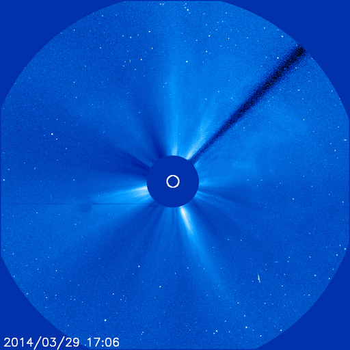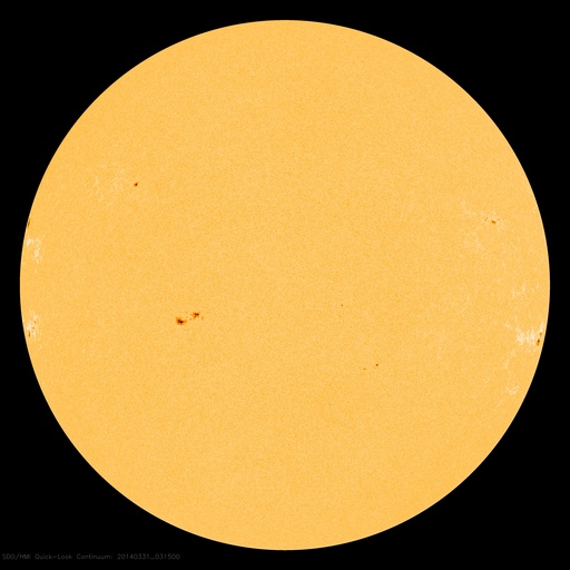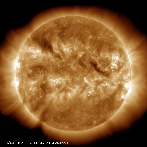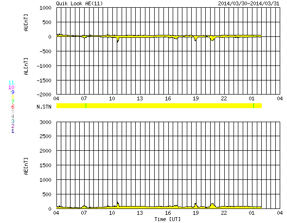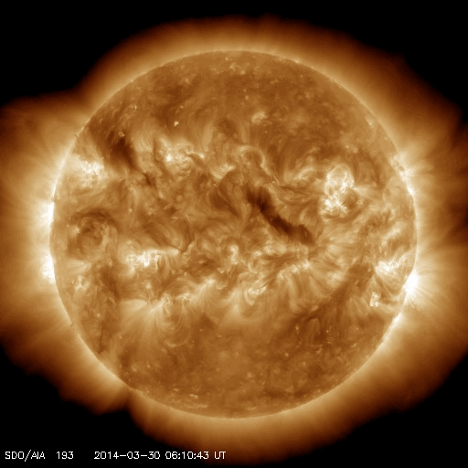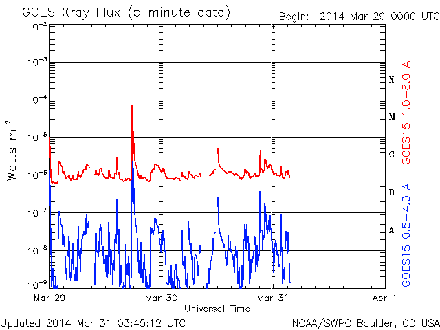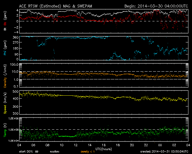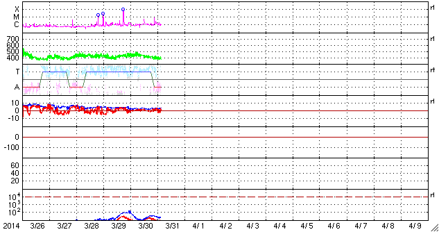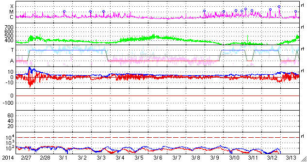 2014/ 3/31 12:50 更新 M2.1の中規模フレアが発生しました。太陽風は平均的な速度で、磁気圏も穏やかです。 担当 篠原 2017黒点群は、昨夜、30日21時(世界時30日12時)にも M2.1の中規模フレアを起こしました。 SDO衛星AIA193の動画を掲載します。 中心から右上にある2017群で一瞬明るい輝きが発生しています。 続いて、コロナのガスが噴き出す様子も写っていて、 SOHO衛星LASCO C3では、CMEの噴出が撮影されています。 昨日のX1.0のフレアのCMEと共に動画にしました。 M2.1のCMEは、右上の方向に向かっていて、 地球への影響はなさそうです。 太陽では、南東の端から現れた2026黒点群で、 C1〜3の小規模フレアが10回ほど発生しています。 黒点群はこれから地球側に動いてくるので、 今後の活動に注目して下さい。 太陽府は、昨日のニュース以降ゆっくりと速度が下がって、 今日に入った頃には400km/秒と平均的な速度に戻りました。 磁場強度は3nTとやや弱まった状態です。 磁場の南北成分は北寄りに振れていて、 磁気圏は静穏でしたが、 今朝くらいから、太陽風の磁場の傾向が変わり、 南北に振れる様になっています。 振れ幅は小さいので、影響は小さいですが、 この傾向が続けば、磁気圏の活動もいくらか高まるかもしれません。 太陽風は、明日か明後日くらいに CMEによる乱れが到来する可能性があります 規模はあまり大きくないと思いますが、 磁場が強まって南向きに大きく振れると、 活発なオーロラの活動を起こす可能性があります。 ![]() 2017黒点群で発生したM2.1フレア。SDO衛星AIA193。 (c) SDO (NASA)、 (動画加工 : 宇宙天気ニュース) ![]() 2017黒点群のX1.0フレアとM2.1フレアに伴って発生したCMEの噴出。 (c) SOHO (ESA & NASA)、 (動画加工 : 宇宙天気ニュース) ![]() SDO衛星のAIA193カメラによる太陽コロナの様子 (c) SDO (NASA) ![]() SDO衛星による太陽の可視光写真。マウスの矢印を写真に重ねると、黒点番号付きの写真に切り替わります。 (c) SDO (NASA) ![]() GOES衛星の太陽X線データ (c) NOAA/SWPC ![]() ACEが観測した太陽風の磁場(1番上の枠、白線は全体の強度、赤線は南北成分) および、太陽風の密度(3番目の橙線)、速度(4番目の黄線) (c) NOAA/SWPC ![]() リアルタイムAE指数 下段のAEグラフの値が高くなると、オーロラ活動が活発化しています。 (c) 京都大学, NICT ![]() 27日の太陽周期に合わせたデータプロット 太陽が同じ面を地球に向けていた27日前の変化から、今後を予想することができます。 (c) 作図:宇宙天気ニュース