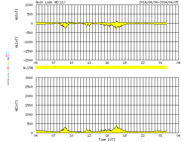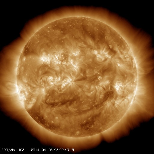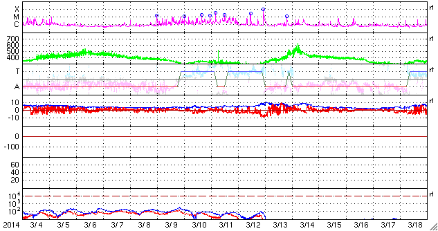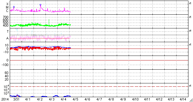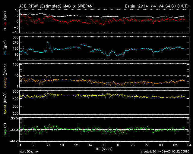2014/ 4/ 5 12:22 更新 太陽風は420km/秒と穏やかです。CMEによる乱れはまだ到来していません。 担当 篠原 太陽風は、平均的な状態の風が続いていて、 CMEに関係する乱れはまだ到来していません。 現在の速度は420km/秒と、昨日からほとんど変わっていません。 磁場強度は少し下がって、3nTとやや弱くなっています。 フレアの発生が2日の深夜だったので、 発生から2日半経過したくらいです。 引き続き太陽風の変化に注目して下さい。 今後、到来が遅くなれば速度の変化もより小さくなりますが、 磁場が強まって大きく南向きに振れることで、 磁気圏の活動は大きく乱れます。 擾乱到来後は、ACEの磁場データにも注目して下さい。 太陽は、左上の2027、2030黒点群、中央の2026群、 右下の2021群と3カ所で、 Cクラスの小規模フレアが活発に発生しています。 大きいものは、2027群のC8.3と、2021群のC6.2です。 黒点群の姿も変化していて興味深く、 SDO衛星の可視光写真より、 2021群の1日半の変化を動画にします。 NOAAの報告では、 2021群は磁場構造の複雑さが増しているそうです。 フレアの発生も高まるかもしれません。 ![]() SDO衛星による2021黒点群の1日半の変化。 (c) SDO (NASA)、 (動画加工 : 宇宙天気ニュース) ![]() SDO衛星のAIA193カメラによる太陽コロナの様子 (c) SDO (NASA) ![]() SDO衛星による太陽の可視光写真。マウスの矢印を写真に重ねると、黒点番号付きの写真に切り替わります。 (c) SDO (NASA) ![]() ACEが観測した太陽風の磁場(1番上の枠、白線は全体の強度、赤線は南北成分) および、太陽風の密度(3番目の橙線)、速度(4番目の黄線) (c) NOAA/SWPC ![]() リアルタイムAE指数 下段のAEグラフの値が高くなると、オーロラ活動が活発化しています。 (c) 京都大学, NICT ![]() 27日の太陽周期に合わせたデータプロット 太陽が同じ面を地球に向けていた27日前の変化から、今後を予想することができます。 (c) 作図:宇宙天気ニュース