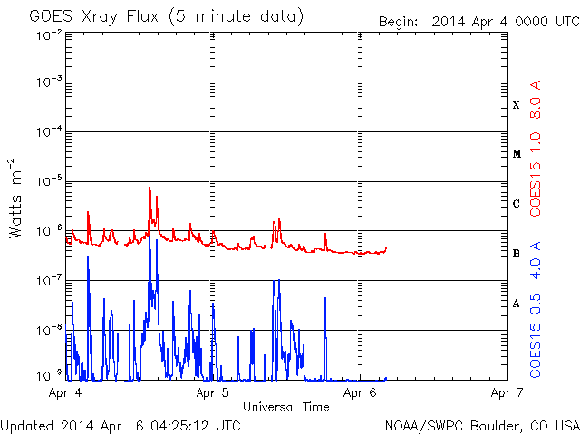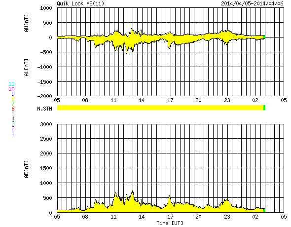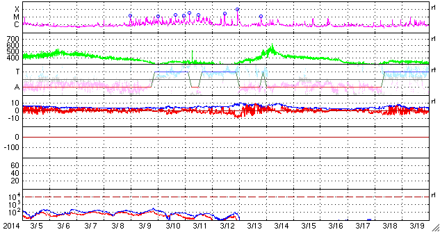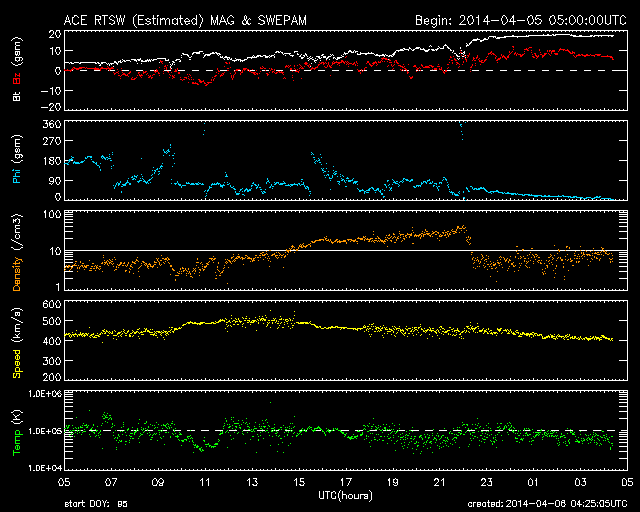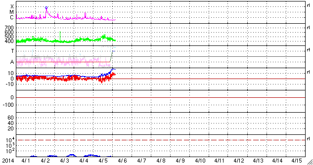 2014/ 4/ 6 13:25 更新 太陽風の弱い乱れが到来しています。磁気圏は比較的穏やかです。 担当 篠原 昨夜から、太陽風の乱れが到来している様です。 5日19時(世界時5日10時)に、 速度が450km/秒から500km/秒に少し上がり、 磁場強度も10nT近くに強まっています。 このあたりから太陽風の変化が始まったようで、 速度はその後は次第に下がっていますが、 プラズマの密度は10個/cm^3未満から40個/cm^3に増加し (現在は下がっています)、 磁場強度も20nT近くまで高まっています。 全体としてあまりはっきりしない変化で、 CMEの乱れは地球方向にはあまり向いていなかった様です。 太陽風の磁場は強まっていますが、 今のところ南北成分は0nTから北寄りに振れています。 このため、磁気圏の活動は小規模に留まり、 AE指数は300〜700nTの中小規模の変化くらいです。 しかし、磁場強度が高いまま南北成分が反転すると、 南向きに大きく振れるため、 磁気圏の活動を一段強める可能性があります。 磁場が強まっている間は、注意が必要です。 太陽は、中央の2026黒点群でC1.6、C1.9, 西の2021群でC1.0と小さいフレアが発生した程度です。 2026群の黒点は少なくなっていて、 縮小の傾向にあるようです。 SOHO衛星LASCO C3によると、 太陽の南東(左下)へCMEが噴き出しています。 これは、STEREO衛星によると太陽の裏側の現象です。 STEREO Behind衛星は太陽のほとんど反対側に位置しています。 EUVI 195の動画を見ると、 太陽の右下でフィラメント噴出が発生しています。 これが地球側から見た左下へのCMEの噴出に繋がった様です。 この様な3次元的な分析ができるのも、 様々な太陽観測衛星が活躍しているお陰です。 今日は鹿児島高専の入学式です。 約200名の新入生が学校にやって来ました。 春休みで静まりかえっていた校舎が少しにぎやかになりました。 ぎりぎり残った桜の花が、新一年生を迎えています。