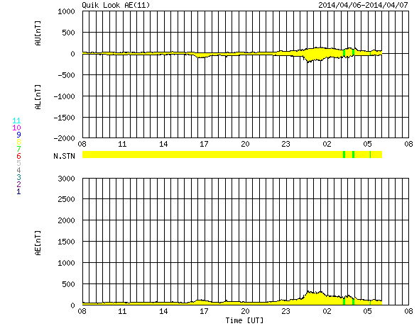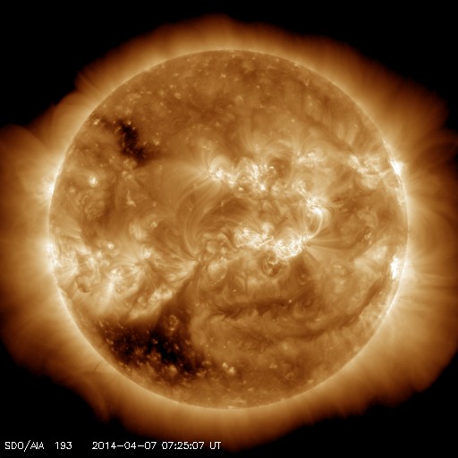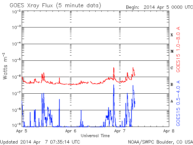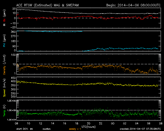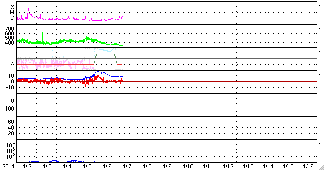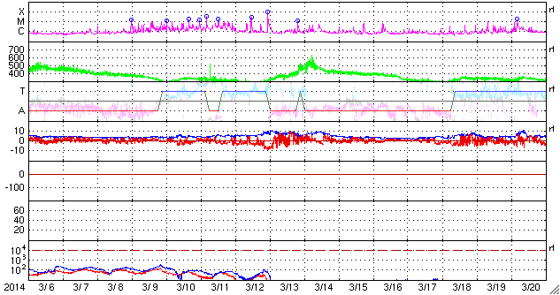 2014/ 4/ 7 16:32 更新 太陽風磁場強度の強まりは少し残っています。太陽はCクラスのフレアが数回起きています。 担当 篠原 昨日、20nT近くに強まっていた太陽風の磁場強度は、 その後ゆっくりと下がって、今朝には10nTとなりましたが、 そこで低下は停止して、現在も10nTと強まった状態が続いています。 太陽府の速度は、400km/秒から350km/秒へ下がり、 低速の風に変わっています。 磁場の南北成分は、昨日のニュース以降は、 0nT付近を変化しています。 このため、磁気圏の活動は特に高まらず、 AE指数のグラフは概ね穏やかな状態が続いています。 この後、磁場強度が下がってくれば、 CMEによる太陽風の乱れも終わりです。 SDO衛星AIA193の太陽コロナ写真を見ると、 太陽の南東側(左下)にコロナホールが暗く大きく広がっています。 27日周期の図で、 前周期にあたる3月13〜14日の太陽風速度の高まりが このコロナホールに関係している可能性があります。 すると、4月9〜10日頃に太陽風の乱れが回帰するかもしれません。 太陽では、中央から少し北西(右上)に2031黒点群が出現しています。 ここでC3.8、C1.8と小規模フレアが発生し、 その後、すぐ下の2026黒点群でC4.0の小規模フレアが起きています。 その様子をGOES衛星のX線カメラの動画で紹介します。 この後も活動を続けるのかどうか、注目して下さい。 今日は、新しく担任を持つ1年生のクラスの行事で、 記事の更新が遅くなりました。 今週いっぱいは不定期な更新になりそうです。