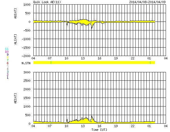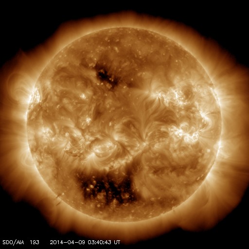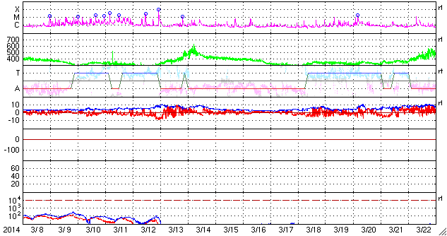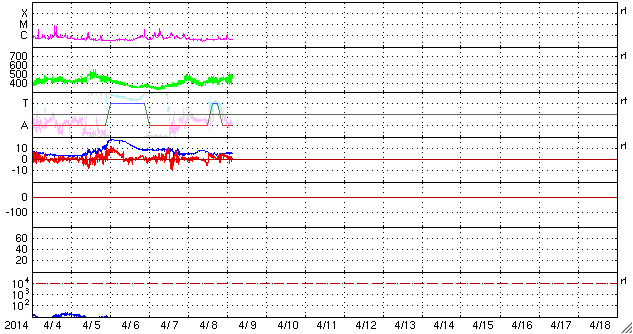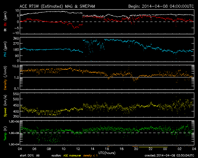 2014/ 4/ 9 12:50 更新 太陽風はやや高速の状態が続いています。太陽のフレア活動は穏やかです。 担当 篠原 太陽風の速度(ACEの図の黄色線)は、 450km/秒とやや高めの状態が続いています。 磁場は、途中に小規模の変化が発生したりしていますが、 全体としては強度(白線)は5nTと平均的な状態です。 磁場の南北成分(赤線)は、前半は0nT付近ですが、 後半は北向き(プラス方向)の状態が続いています。 このため、オーロラの活動度を示すAE指数のグラフは、 前半に小さい変化が見られますが、 後半は変化がなくなっています。 概ね、磁気圏は穏やかです。 SDO衛星AIA193の太陽コロナ写真では、 南半球に広がるコロナホールは、 太陽の西側(右側)へ進んでいます。 現在の太陽風もやや高速ですが、 今後、この領域の影響が及ぶようになると、 更に速度が高まる可能性があります。 太陽は、2031黒点群でC1.2の小さいフレアが起きた程度で、 活動は落ち着いています。 東端(左端)から現れた黒点は、2032群と番号が付きました。 黒点の数がやや多い様ですが、 フレアの活動はどうなるでしょうか。 今日は、新入生約200名を連れて、 大隅半島の研修所へ1泊2日の合宿に来ています。 薄曇りの穏やかな天気で、楽しく屋外活動ができそうです。 ![]() SDO衛星のAIA193カメラによる太陽コロナの様子 (c) SDO (NASA) ![]() SDO衛星による太陽の可視光写真。マウスの矢印を写真に重ねると、黒点番号付きの写真に切り替わります。 (c) SDO (NASA) ![]() ACEが観測した太陽風の磁場(1番上の枠、白線は全体の強度、赤線は南北成分) および、太陽風の密度(3番目の橙線)、速度(4番目の黄線) (c) NOAA/SWPC ![]() リアルタイムAE指数 下段のAEグラフの値が高くなると、オーロラ活動が活発化しています。 (c) 京都大学, NICT ![]() 27日の太陽周期に合わせたデータプロット 太陽が同じ面を地球に向けていた27日前の変化から、今後を予想することができます。 (c) 作図:宇宙天気ニュース