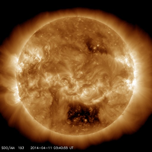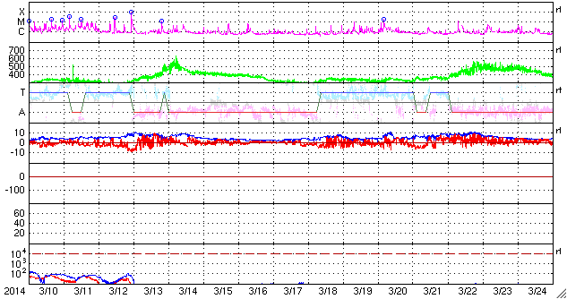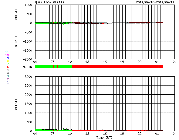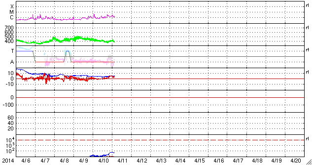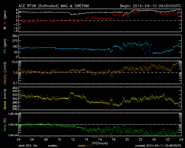 2014/ 4/11 12:48 更新 太陽風は穏やかで、磁気圏も静穏です。ムルマンスクのオーロラをどうぞ。 担当 篠原 ロシア、ムルマンスクの福島さんより、 4月6日に撮影されたオーロラの写真が届きました。 ムルマンスク州では、空の明るい時間がどんどん長くなっていて、 オーロラの観望できる時間帯は、23〜5時になっているそうです。 1枚目の写真は、 アパチット市から西へ10km程離れたエコストロフスキィ海峡で、 現地午前3時頃に、 同市在住のジガーロフ・ヴァレンチン氏により撮影されたものです。 とても華やかな色のオーロラが空をおおっています。 2枚目はオレネゴルスク市で、 同市在住のバタヴィン・ヴィクトル氏により撮影されました。 乳緑色に強く輝くオーロラが夜空を分けています。 福島さんによると、 ムルマンスクでは4月に入ったのに時々吹雪いていて、 春はまだ遠そうだとのことです。 次第に観測時間の短くなる中で撮影された貴重なオーロラの姿を ありがとうございます。 オーロラの見事さに目を奪われるのはもちろんですが、 まだ寒そうな、地上の雪景色も印象的です。 太陽風は、400km/秒前後と平均的な速度が続いています。 磁場強度も4〜5nTで安定していて、太陽風は穏やかです。 コロナホールによる太陽風の乱れは来ていませんが、 SDO衛星AIA193の太陽写真では、 コロナホールは太陽の西半球側に半分ほど進んだくらいで、 影響の到来はこれからかもしれません。 引き続き、ACE衛星の太陽風データに注目して下さい。 磁気圏の活動は静穏で、AE指数はほとんど変化していません。 太陽風磁場の南北成分は北寄りに推移しています。 太陽は、東の端から活動的な領域が近づいています。 SDO衛星AIA131の動画を掲載します。 可視光写真では、黒点がぎりぎりで顔を出しています。 今後はこちら側の活動になるので、 活動が強まれば影響も大きくなるでしょう。