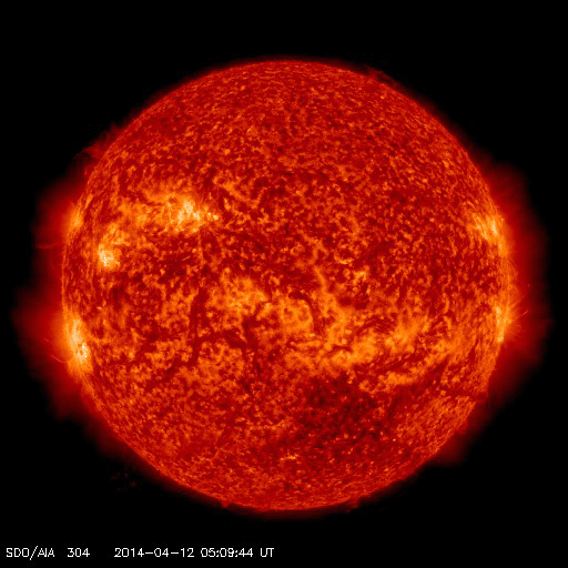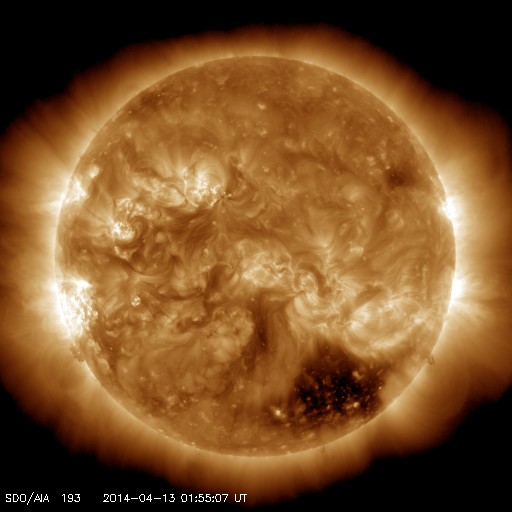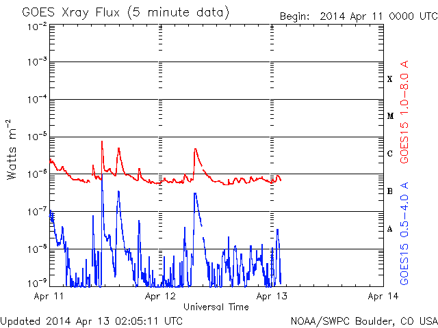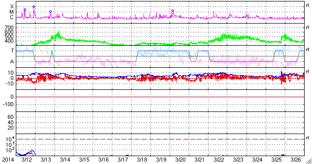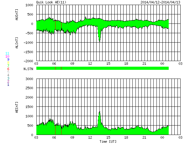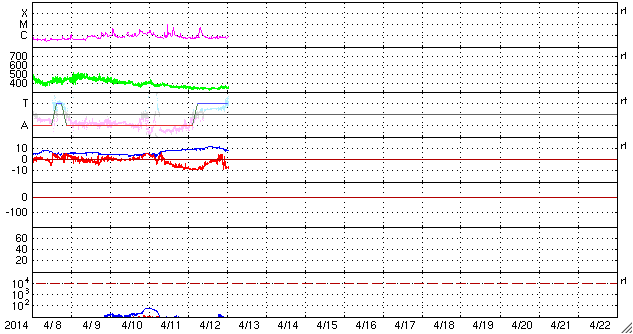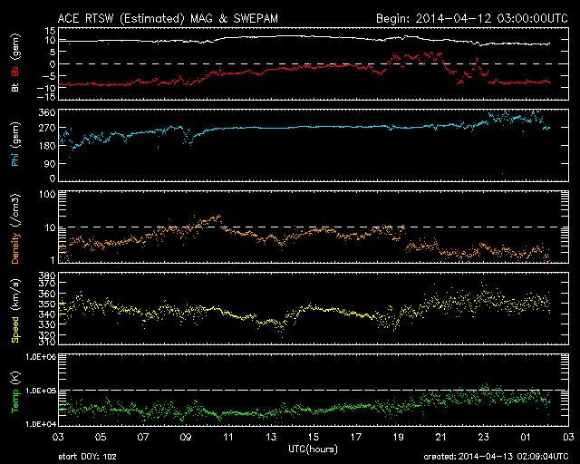 2014/ 4/13 11:09 更新 太陽風磁場の強まりは続いています。中規模の磁気嵐が発生しました。 担当 篠原 太陽風磁場の強まりは、現在も続いています。 今朝まで10nTに強まった状態が続き、 その後少し下がって、現在は8nTです。 太陽風の速度は350km/秒と低速で安定しています。 このため、磁場の乱れも長い時間続いている様です。 太陽風磁場の南北成分は、 強度の変化はありますが、南向きの傾向が続いています。 このため、AE指数のグラフは400〜600nTの変化が長時間続き、 一時的に1200nTに達する大きな変化も起きています。 京都大学WDCのDst指数は、 最大で-90nTの変化に達し、中規模の磁気嵐が発生しました。 太陽風磁場の強まりは、次第に収まっていくでしょう。 一方、SDO衛星AIA193の太陽写真の 南半球に広がるコロナホールの影響は特に見られず、 太陽風はこのまま穏やかに過ぎていくのでしょうか。 昨日午後、12日16時(世界時12日7時)に、 太陽の東端の2035黒点群で C5.0の小規模フレアが発生しています。 この時に、太陽からガスが激しく噴き上がっていく様子を SDO衛星AIA304で見ることができました。 目立ったフレアはこの1つだけでしたが、 この領域の活動は今後どうなるでしょうか。 今日の鹿児島は、冷たい雨が降っています。 今日は寮の日直で、寒い当直室にこもっています。 寮生の多くは自宅に戻っていて、寮の中は静かです。