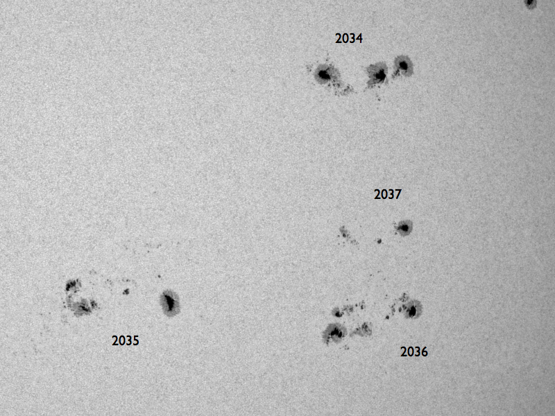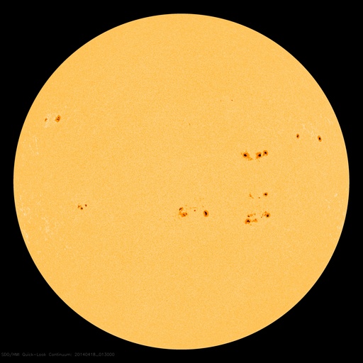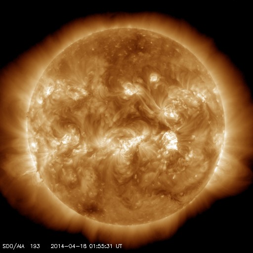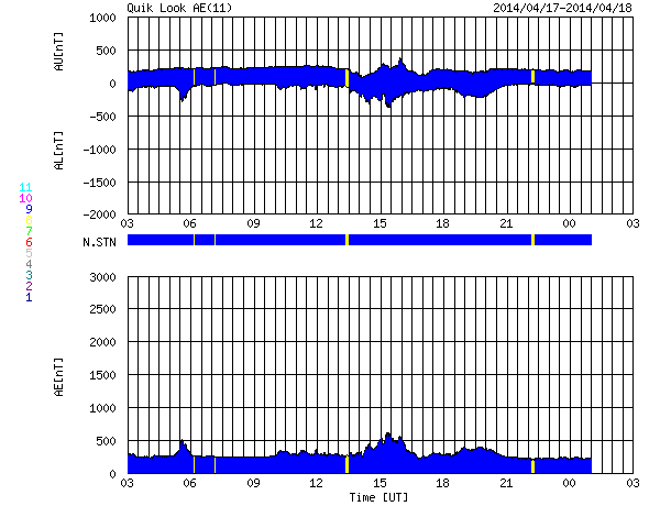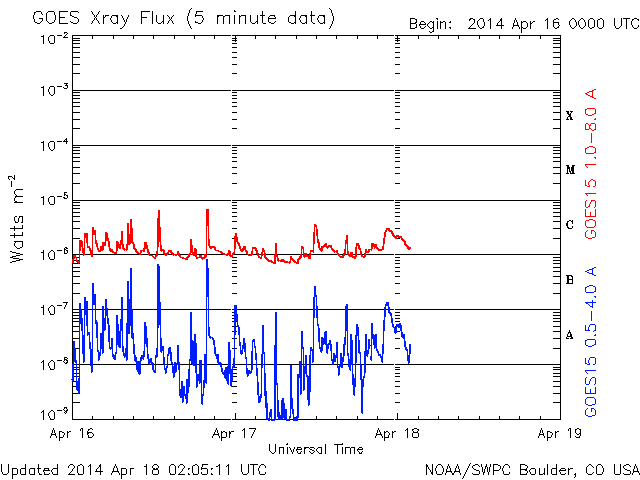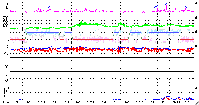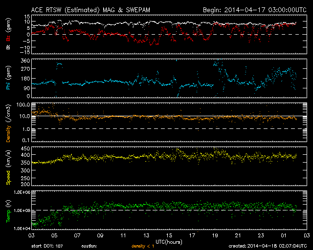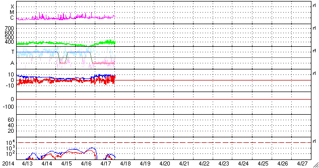 2014/ 4/18 11:07 更新 フレアの発生は弱まっています。太陽風は400km/秒に上がっています。 担当 篠原 太陽の中心部には4つの大きい黒点群が見えています。 その2034、2035、2036、2037黒点群の様子を、 SDO衛星可視光写真の拡大写真で紹介します。 昨日と同じ大きさで切り出したので、変化を比較して下さい。 すると、2034群と2035群は黒点が増えている一方、 2036群はやや小さくなっている様です。 フレアの発生も、2036群が多く、 C1〜2の小さいフレアを4回ほど起こしてますが、 全体としてフレアの発生頻度は下がっています。 そして、太陽の東端の向こう側から 活動的な領域が近づいている様です。 GOES衛星のX線写真では明るい輝きが見え始めています。 どの様な領域が姿を現すか、注目して下さい。 太陽風は、昨日の午後、17日15時(世界時17日6時)くらいに、 速度が400km/秒に上がり、以降、この状態で安定しています。 注目していた太陽風速度の高まりが 1日ほど早まって回帰してきた様です。 磁場強度も8〜10nTと少し強まった状態が続いています。 磁気圏の活動度は、AE指数のグラフが太くなったままで 読み取りにくいのですが、 所々に小規模の変化が発生しています。 太陽風の磁場がやや強まっていて、 速度も平均レベルに上がっているので、 磁場が南向きに振れると、ある程度活発な変化が起きそうです。 太陽風速度の高まりは、 27日前の前周期は500km/秒台まで高まりました。 今回は今のところ400km/秒程度ですが、 もうしばらく変化に注目して下さい。 2日くらいで速度の高まりが通過した後は、 穏やかな太陽風に戻りそうです。 新学期が始まって2週間が経ちました。 今年は1年生の担任を持っていることもあって、 まだばたばたと走り回っている感じです。 窓の外の桜の木は、すっかり新緑に変わっています。