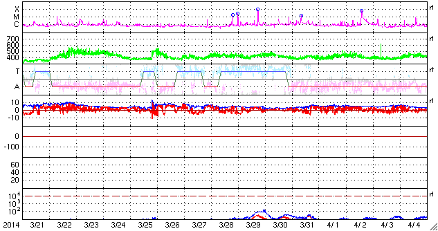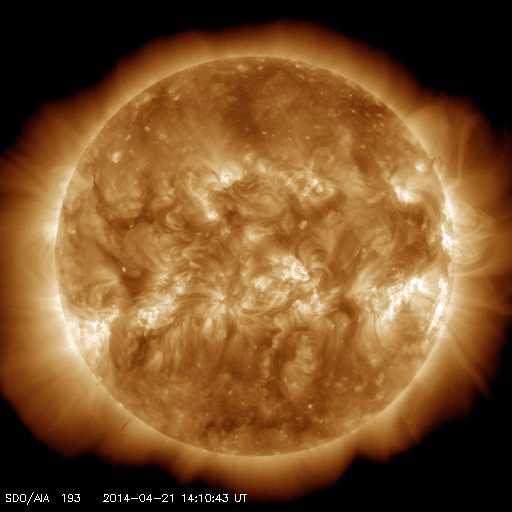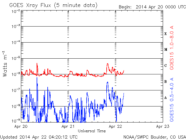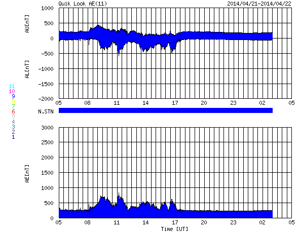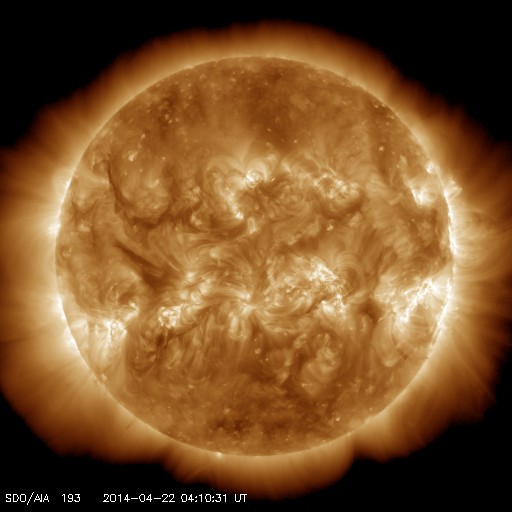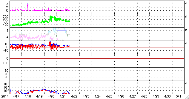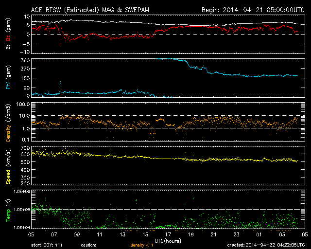 2014/ 4/22 13:22 更新 太陽風は500km/秒の高速状態が続いています。Cクラスのフレアが発生しています。 担当 篠原 太陽風の速度は、昨夜、21日19時(世界時21日10時)頃まで 600km/秒台を保ちましたが、 その後8時間ほどかけてゆっくりと500km/秒に下がり、 今朝から現在までは、そのまま500km/秒の高速風が続いています。 磁場強度は5nTを前後していて、通常の強度に戻っています。 磁気圏活動への影響度を決める磁場の南北成分は、 ACEの図の前半に弱い南向きの時間帯があり、 その頃にAE指数は中規模の変動をしています。 その他は磁場は北向きで、AE指数もほとんど変化していません。 今回の太陽風の乱れでは、磁場は北向きに振れることが多く、 磁気圏の変動はあまり強まらずに推移しています。 CMEによる太陽風の高まりも、後半に入っている様です。 この後、速度は次第に低下して、 明日には普通の状態に戻っているかもしれません。 太陽は、中央の2038黒点群の活動がやや高まって、 C2.0、C1.1、C5.1、C3.0と小規模フレアを起こしています。 このうちのC5.1フレアの様子を、 SDO衛星AIA193の動画で紹介します。 X線の変化が長く続くタイプのフレアで、 SDO衛星の写真の様子では、 弱いCMEも発生しているかもしれません。 その他の活動的な領域は、太陽の西側にだいぶ傾いています。 これらの群が去ると、太陽は穏やかになりそうです。