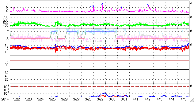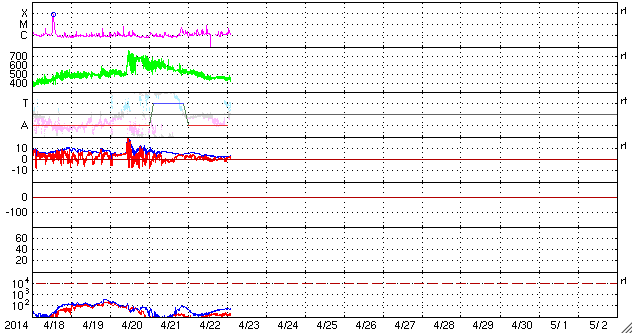 - 2014/ 4/21 12:03 太陽風の乱れが到来して、速度は700km/秒に達しました。磁気圏の活動も高まっています。