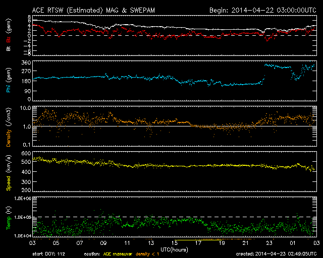 - 2014/ 4/22 13:22 太陽風は500km/秒の高速状態が続いています。Cクラスのフレアが発生しています。