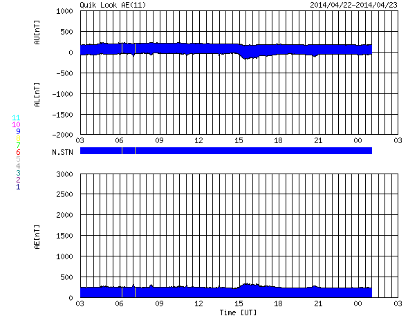 磁気圏は静穏で、AE指数のグラフはほとんど変化していません。
