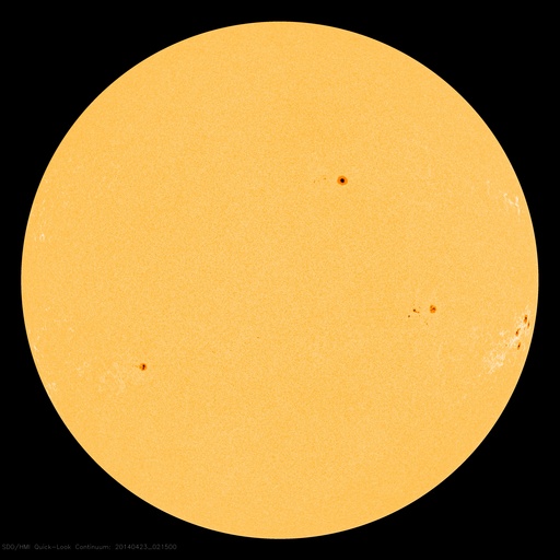 SDO衛星による太陽の可視光写真。マウスの矢印を写真に重ねると、黒点番号付きの写真に切り替わります。