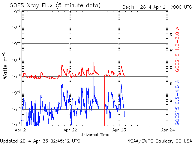 - 2014/ 4/18 11:07 フレアの発生は弱まっています。太陽風は400km/秒に上がっています。