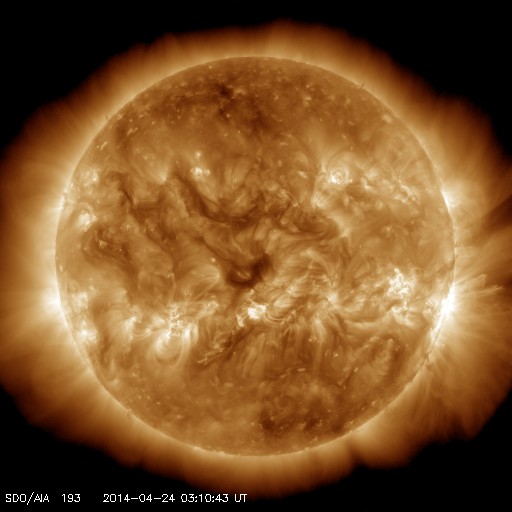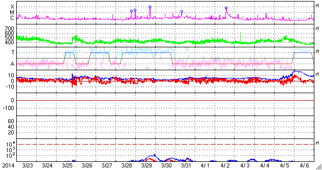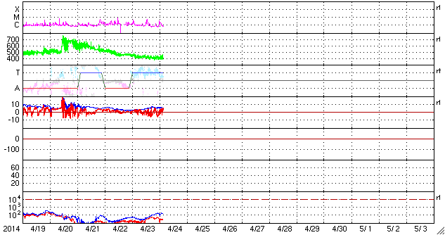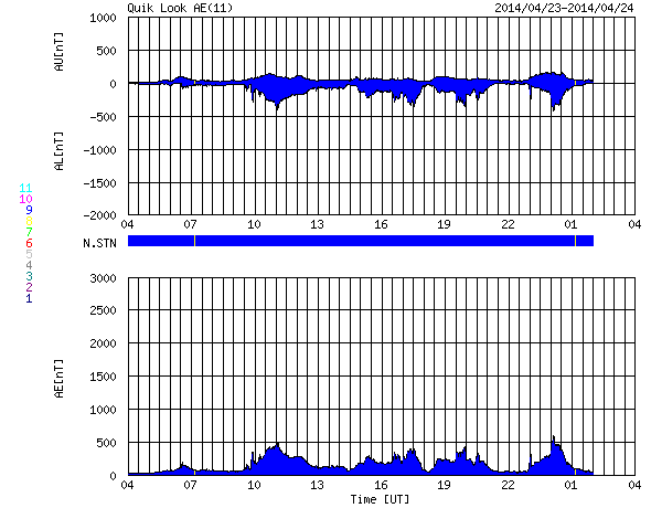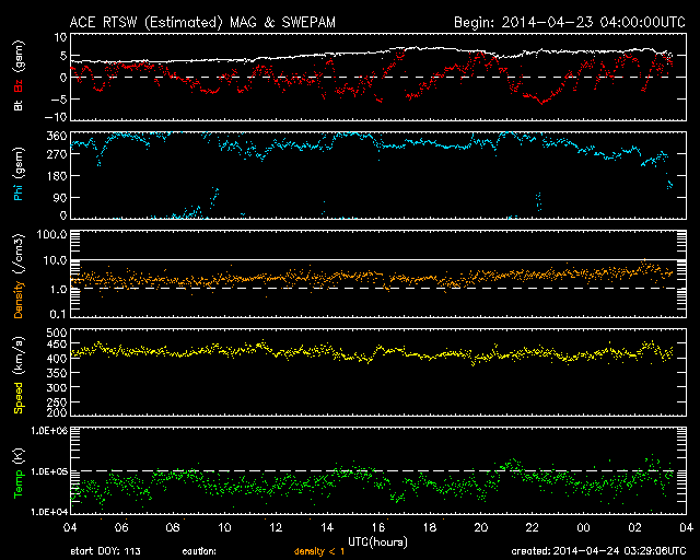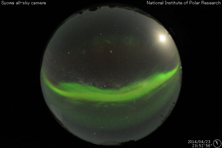 2014/ 4/24 12:29 更新 太陽風の磁場が南寄りに振れ、磁気圏の活動がやや活発になっています。 担当 篠原 太陽風の速度は、420km/秒付近で低下が止まり、 現在までこの状態が続いています。 磁場強度は5nT前後と平均的な値ですが、 南北成分がゆっくりと南北に振れる様になっています。 このため、磁気圏では小規模の変化が頻繁に発生していて、 AE指数は300〜500nTの変化が続いています。 このうち、世界時24日0時頃のオーロラの様子を、 南極昭和基地の全天カメラの動画で紹介します。 空全体をオーロラの見事な光が覆っています。 AE指数のグラフを見ると、 この時刻に500nTの変化が発生しています。 27日周期の図を見ると、 前周期の太陽風は400km/秒台の速度が続いています。 今回も同じような状態が続くかもしれません。 太陽は、C1〜5の小規模フレアが6回ほど発生しています。 多くは2035群ですが、 中央部の2044群でもC3.3のフレアが起きています。 2044群は、黒点が再び見えるようになっています。 ![]() 南極の昭和基地で、世界時24日0時に観測されたオーロラ。 (c) 国立極地研究所、(動画加工 : 宇宙天気ニュース) ![]() SDO衛星のAIA193カメラによる太陽コロナの様子 (c) SDO (NASA) ![]() SDO衛星による太陽の可視光写真。マウスの矢印を写真に重ねると、黒点番号付きの写真に切り替わります。 (c) SDO (NASA) ![]() ACEが観測した太陽風の磁場(1番上の枠、白線は全体の強度、赤線は南北成分) および、太陽風の密度(3番目の橙線)、速度(4番目の黄線) (c) NOAA/SWPC ![]() リアルタイムAE指数 下段のAEグラフの値が高くなると、オーロラ活動が活発化しています。 (c) 京都大学, NICT ![]() 27日の太陽周期に合わせたデータプロット 太陽が同じ面を地球に向けていた27日前の変化から、今後を予想することができます。 (c) 作図:宇宙天気ニュース