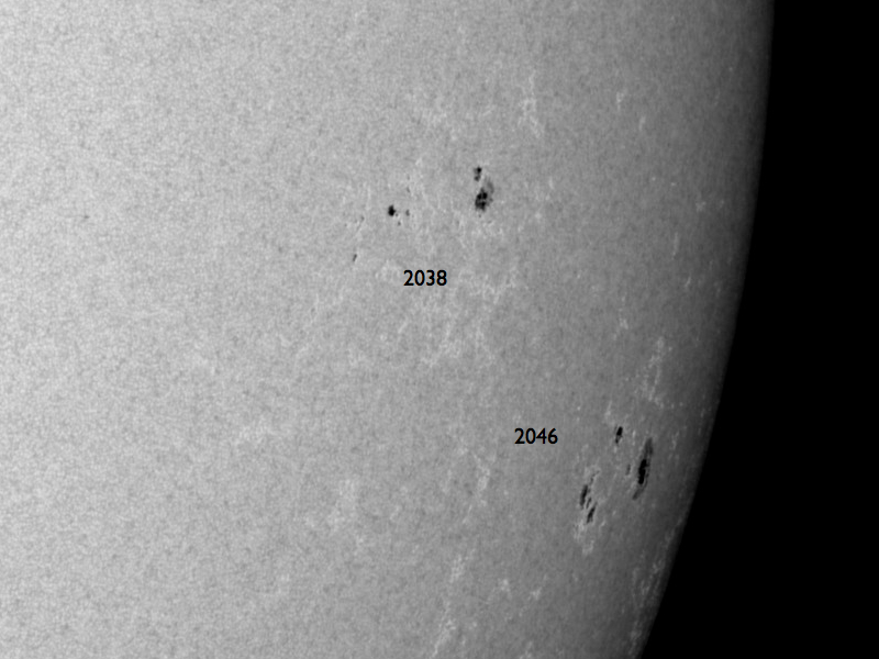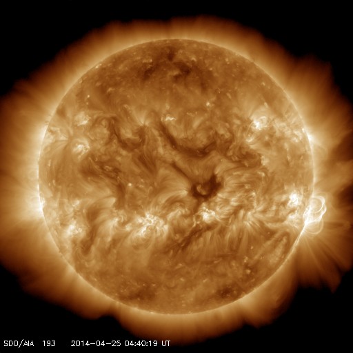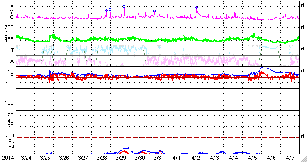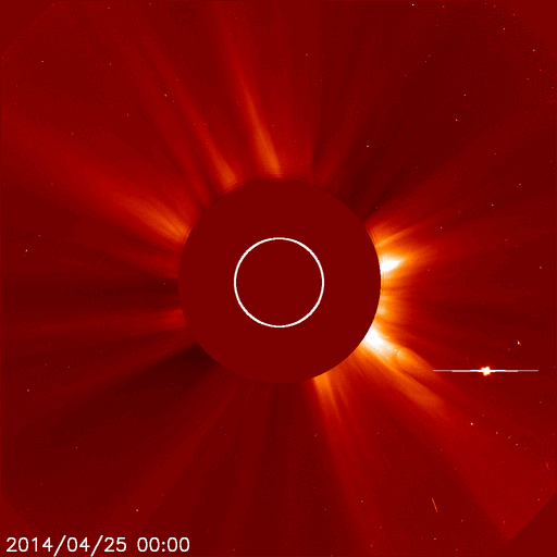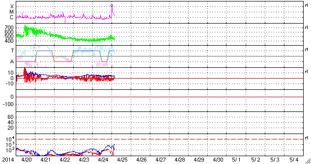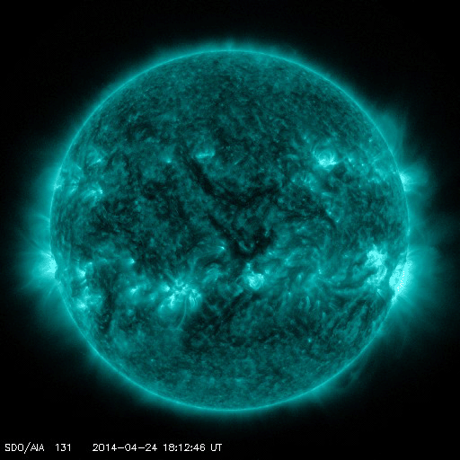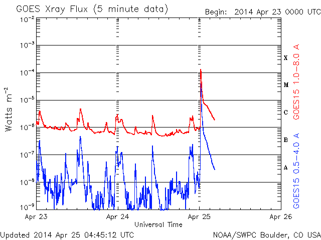 2014/ 4/25 13:50 更新 太陽でX1.3の大規模フレアが発生しました。CMEも発生しています。 担当 篠原 今朝、25日9時半(世界時25日0時半)に、 太陽の西の端近くの2046黒点群で、 X1.3の大規模フレアが発生しました。 Xクラスのフレアの発生は、3月29日のX1.0以来で、 およそ1ヶ月ぶりのことです。 フレアの様子をSDO衛星AIA131の動画で紹介します。 右端が急激に明るく輝き、 その後にできるガスの明るいループが印象的です。 2046黒点群の様子を拡大写真で紹介します。 西に沈んでいった2035黒点群の左隣りに発生した黒点群です。 大きな活動を起こしたものの、これからすぐに沈んでいきます。 X1.3フレアに伴って、CME(太陽ガスの放出現象)も発生しています。 SOHO衛星のLASCOカメラでは、 太陽の右に向かって激しくガスが噴き出しています。 まだ起きたばかりなので、詳しくは分かりませんが、 横へ飛び出しているので、 地球への影響は小さいか、ほとんど見られないでしょう。 太陽では、この領域以外に特に活動は見られず、 これから穏やかな状態になりそうです。 太陽風は、速度が少し高まって、 460km/秒とやや高速になっています。 磁場強度は5nT前後と平均的な値です。 磁場の南北成分は南寄りで推移していて、 この影響で、磁気圏の活動はやや高まっています。 AE指数のグラフは、500nTを超えるくらいの中規模の変動が 繰り返し発生しています。 太陽にはコロナホールはなく、 太陽風も基本的には穏やかに推移するでしょう。 磁場の振れ方によっては、現状の様な磁気圏の活動も発生します。 ![]() 西の端の2046黒点群で発生したX1.3の大規模フレア。SDO衛星AIA131。 (c) SDO (NASA)、 (動画加工 : 宇宙天気ニュース) ![]() 太陽の西の端の2046黒点群。SDO衛星の可視光写真。 (c) SDO (NASA) ![]() X1.3のフレアに伴って発生したCME。西へ横方向に噴き出しています。 (c) SOHO (ESA & NASA)、 (動画加工 : 宇宙天気ニュース) ![]() SDO衛星のAIA193カメラによる太陽コロナの様子 (c) SDO (NASA) ![]() SDO衛星による太陽の可視光写真。マウスの矢印を写真に重ねると、黒点番号付きの写真に切り替わります。 (c) SDO (NASA) ![]() GOES衛星の太陽X線データ (c) NOAA/SWPC ![]() ACEが観測した太陽風の磁場(1番上の枠、白線は全体の強度、赤線は南北成分) および、太陽風の密度(3番目の橙線)、速度(4番目の黄線) (c) NOAA/SWPC ![]() リアルタイムAE指数 下段のAEグラフの値が高くなると、オーロラ活動が活発化しています。 (c) 京都大学, NICT ![]() 27日の太陽周期に合わせたデータプロット 太陽が同じ面を地球に向けていた27日前の変化から、今後を予想することができます。 (c) 作図:宇宙天気ニュース