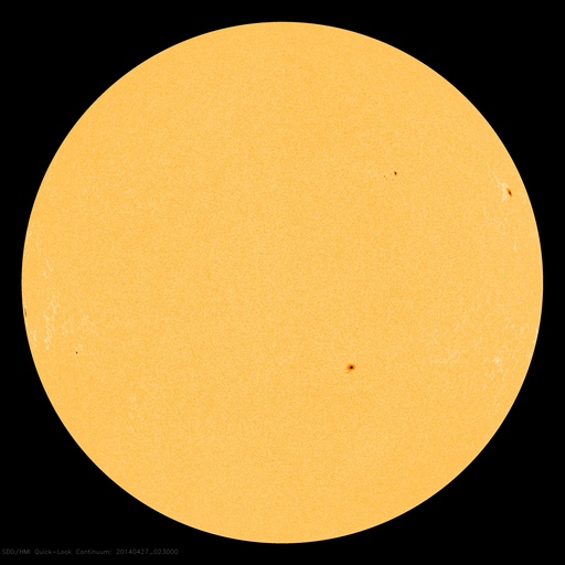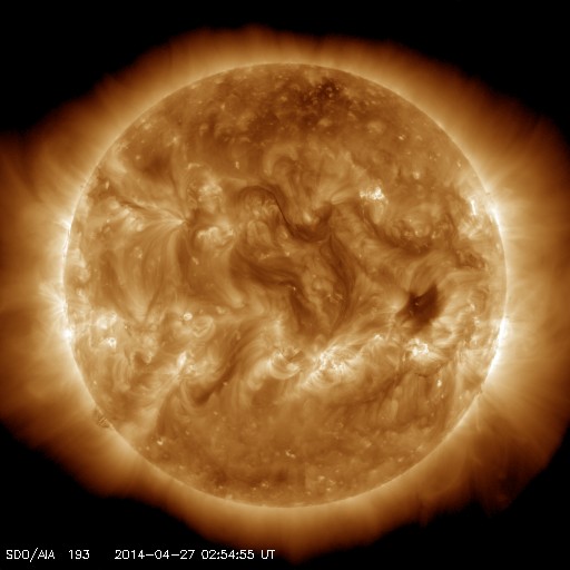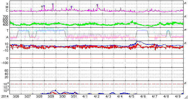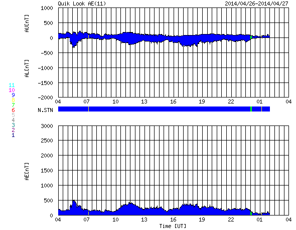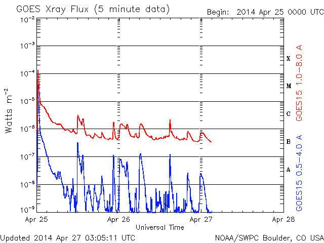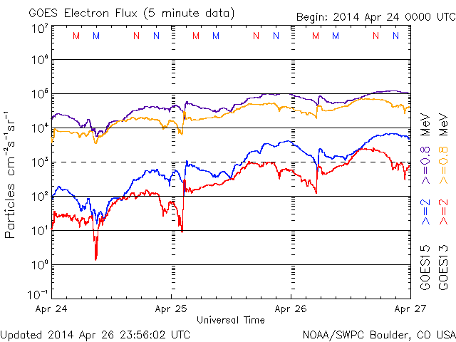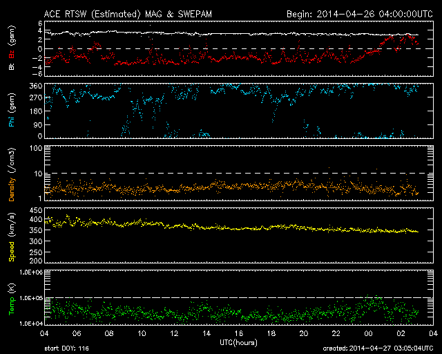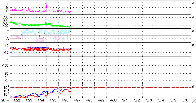 2014/ 4/27 12:06 更新 太陽の活動は穏やかです。太陽風は低速の風になっています。 担当 篠原 太陽では、C1、C2の小さいフレアの発生が3回記録されています。 いずれも東端と西端で発生したもので、 こちら側に見えている黒点群は穏やかです。 可視光写真では、南東(左下)に2047黒点群が発生し、 その向こうの南東の端からも新しい黒点が上がってきています。 また、北西(右上)にも小さい黒点が出現しています。 これらの領域の活動はどの様なものか注目して下さい。 太陽風は、引き続き速度が低下して、 現在は350km/秒と低速の風になっています。 磁場強度も3nTと弱めです。 磁場の南北成分は、 -2nTと振れ幅は小さいですがずっと南を向いていました。 このため磁気圏では小規模の活動が続いている様で、 AE指数では、300nT前後の変化が長い時間見られています。 ACEのグラフでは、 最後のところで磁場の南北成分は北向きに切り替わっています。 この傾向が続くのであれば、 磁気圏の活動は弱まり、穏やかな状態になるでしょう。 ここ数日の太陽風の影響で、 放射線帯の高エネルギー電子の数が増加しています。 GOES衛星のグラフでは青線(GOES15)と赤線(GOS13)は 10,000の線には達していませんが、 すぐ近くまで高まったのは2月21〜22日以来で、 およそ2ヶ月ぶりです。