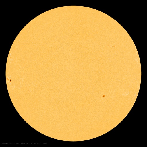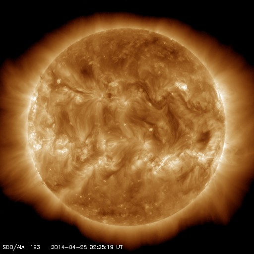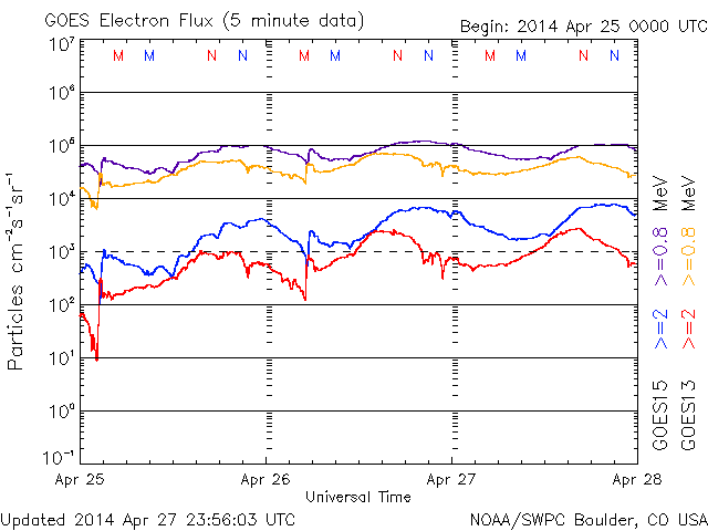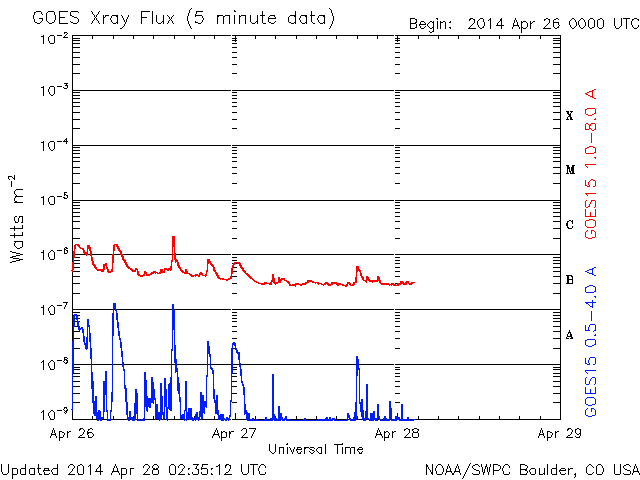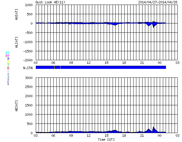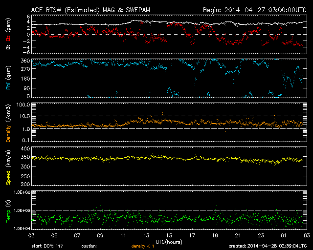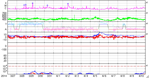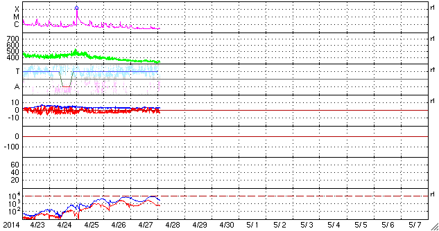 2014/ 4/28 11:32 更新 太陽風は低速で、磁気圏も穏やかです。 担当 篠原 太陽では、北西(右上)に現れた黒点には2048群、 東端(左端)に現れた黒点群には2049群とそれぞれ番号が付き、 更に、北東(左上)の端からも2050群が現れています。 これらの黒点群で目立ったフレアの発生はなく、 太陽は穏やかです。 太陽風は、350km/秒と低速の状態が続いています。 磁場強度も3nTと弱めの値です。 磁場の南北成分は、 小さい振れ幅でゆっくりと南北に振れています。 速度が遅いこともあり、磁気圏は全体としては穏やかですが、 AE指数のグラフの後半に、小さい変化も見えています。 SDO衛星AIA193の太陽コロナ写真では、 コロナホールは見られません。 太陽風は穏やかに推移しそうです。 放射線帯の高エネルギー電子は、 昨日よりも少しだけ高まっていますが、 10,000には達しませんでした。 増加はこのくらいまでで、 以降はゆっくりと減少に向かいそうです。 鹿児島は、今朝から少し冷たい雨になっています。