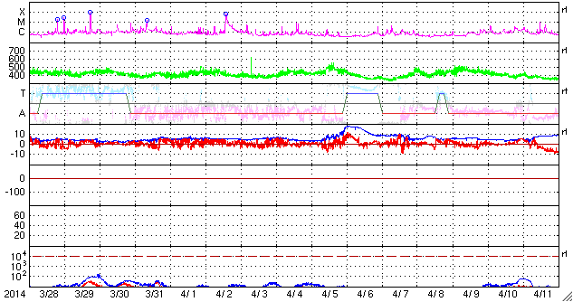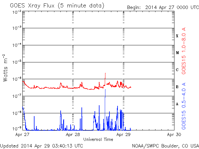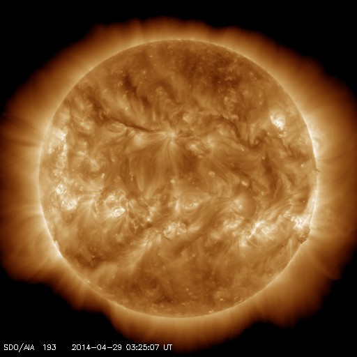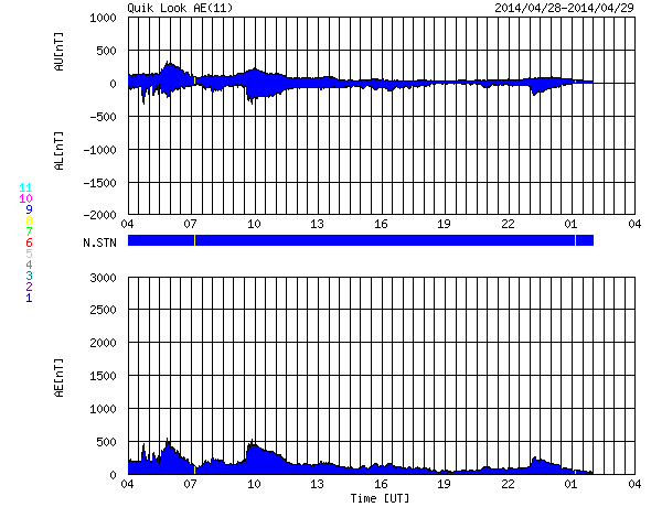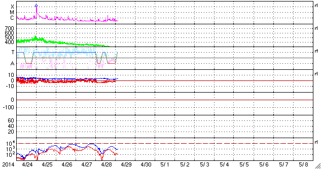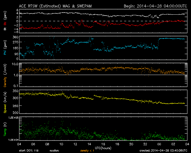 2014/ 4/29 12:32 更新 太陽風はとても遅くなっています。太陽の活動も比較的穏やかです。 担当 篠原 太陽風の速度は更に低下して、 今朝からは265km/秒ととても遅い速度になっています。 磁場強度は3〜4nTとやや弱い状態です。 SDO衛星AIA193の写真では、コロナホールは見られず、 穏やかな太陽風はしばらく続きそうです。 太陽風磁場の南北成分は、 南向きの状態が昨日から続いていました。 このため、磁気圏では小規模の活動が続いていて、 AE指数は300〜500nTくらいの変化が度々発生しています。 しかし、磁場の南北成分は今朝以降は0nT付近に弱まりました。 この傾向が続くと、磁気圏の活動も今後は静かになるでしょう。 太陽は、北西の2048黒点群で C3.4の小規模フレアが発生しましたが、 その他はBクラスの小さいフレアばかりです。 黒点としては、東端の2049群がやや大きく 活動度が高まるようだと注目する必要があるでしょう。 放射線帯の高エネルギー電子は、 今日にかけて一段低下しています。 ![]() SDO衛星のAIA193カメラによる太陽コロナの様子 (c) SDO (NASA) ![]() SDO衛星による太陽の可視光写真。マウスの矢印を写真に重ねると、黒点番号付きの写真に切り替わります。 (c) SDO (NASA) ![]() ACEが観測した太陽風の磁場(1番上の枠、白線は全体の強度、赤線は南北成分) および、太陽風の密度(3番目の橙線)、速度(4番目の黄線) (c) NOAA/SWPC ![]() リアルタイムAE指数 下段のAEグラフの値が高くなると、オーロラ活動が活発化しています。 (c) 京都大学, NICT ![]() 27日の太陽周期に合わせたデータプロット 太陽が同じ面を地球に向けていた27日前の変化から、今後を予想することができます。 (c) 作図:宇宙天気ニュース
