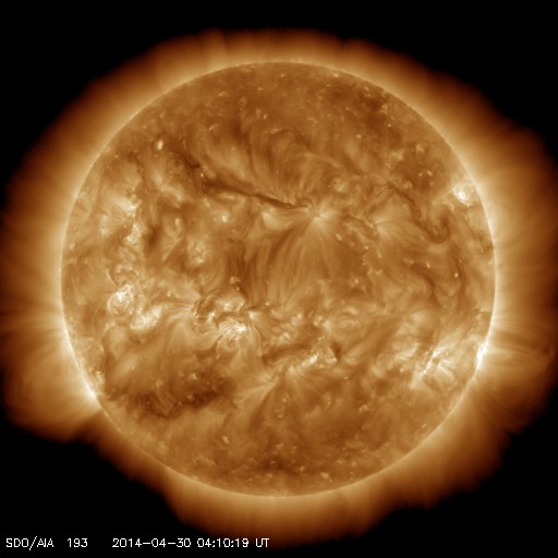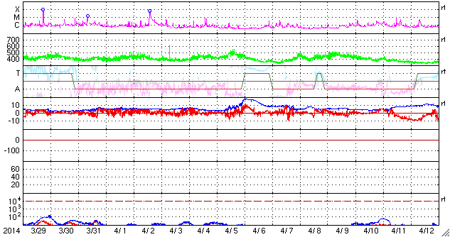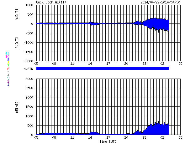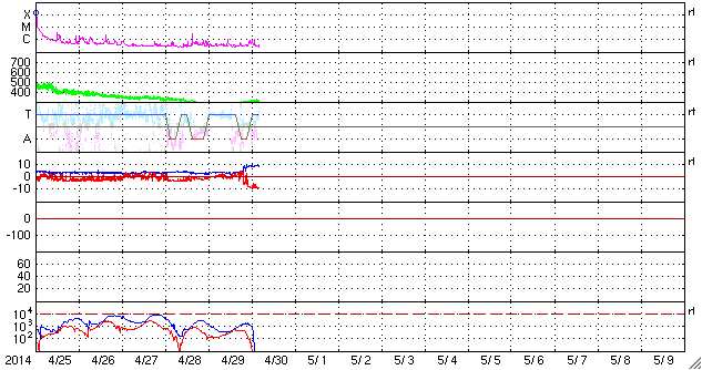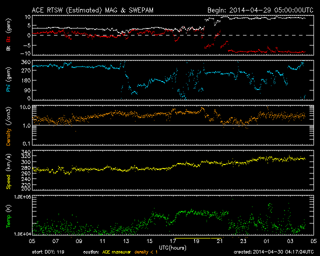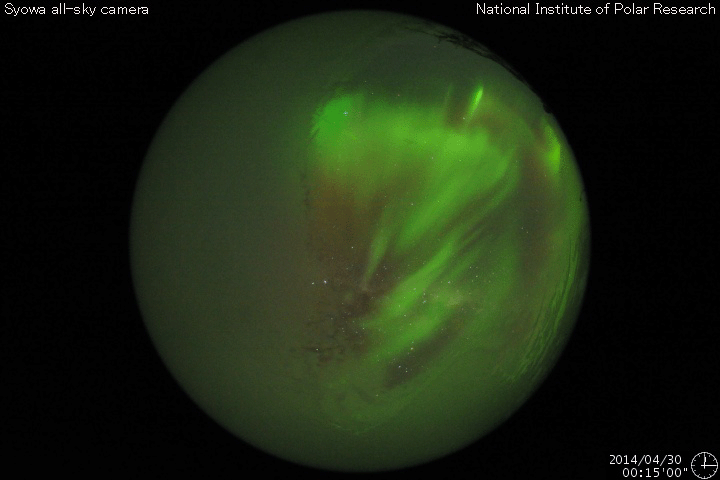 2014/ 4/30 13:17 更新 太陽風磁場が強まり、南向きに振れて磁気圏の活動も高まっています。 担当 篠原 今朝、30日5時(世界時29日20時)頃から、 太陽風の磁場強度が9nTに急に強まっています。 一方、速度には大きな変化はなく、 280km/秒から310km/秒へゆっくりと変化した程度で、 低速の状態は続いています。 CMEによる太陽風の弱い乱れが流れてきたのではないかと思います。 速度の大きさから考えると、4〜5日前くらいの現象でしょうか。 乱れの到来以降、 磁場の南北成分は-9nTくらいまで南向きに大きく振れています。 このため、磁気圏へエネルギーが流れ込みやすくなり、 磁気圏の活動が高まっています。 AE指数のグラフは、 後半から500〜600nTと中規模の変化が続いています。 この高まりに対応する、南極・昭和基地のオーロラの活動を 全天カメラの動画で紹介します。 6秒間隔の撮影なので、オーロラの動きがより滑らかに見えます。 ただ、今日の全天カメラは画面の半分に霜が残っていて、 空の半分はぼやけて見えています。 京都大学のDst指数の速報値も、-50nT程度の変化になっています。 弱い磁気嵐に発達しています。 今後、太陽風磁場の乱れがいつまで続くかですが、 太陽風の速度が遅いので、乱れの通過にはより時間がかかります。 引き続き、太陽風や磁気圏の様子に注目して下さい。 放射線帯の高エネルギー電子は、 昨日以降も低下の傾向は続いていましたが、 今朝の磁気圏の乱れの影響で、更に大きく下がっています。 高まっていた状態は終わりました。 太陽は、Bクラスの小さいフレアが発生した程度で、穏やかです。 2049黒点群と2047群は、昨日よりも少し大きくなっている様ですが、 特に活動が高まっている様子はありません。 ![]() 南極の昭和基地で、全天カメラにより撮影された世界時30日0時半頃のオーロラ。 (c) 国立極地研究所、(動画加工 : 宇宙天気ニュース) ![]() SDO衛星のAIA193カメラによる太陽コロナの様子 (c) SDO (NASA) ![]() SDO衛星による太陽の可視光写真。マウスの矢印を写真に重ねると、黒点番号付きの写真に切り替わります。 (c) SDO (NASA) ![]() ACEが観測した太陽風の磁場(1番上の枠、白線は全体の強度、赤線は南北成分) および、太陽風の密度(3番目の橙線)、速度(4番目の黄線) (c) NOAA/SWPC ![]() リアルタイムAE指数 下段のAEグラフの値が高くなると、オーロラ活動が活発化しています。 (c) 京都大学, NICT ![]() 27日の太陽周期に合わせたデータプロット 太陽が同じ面を地球に向けていた27日前の変化から、今後を予想することができます。 (c) 作図:宇宙天気ニュース