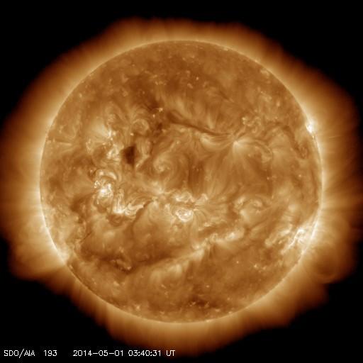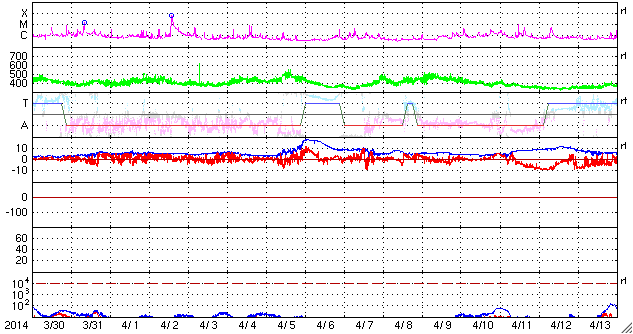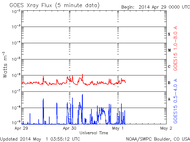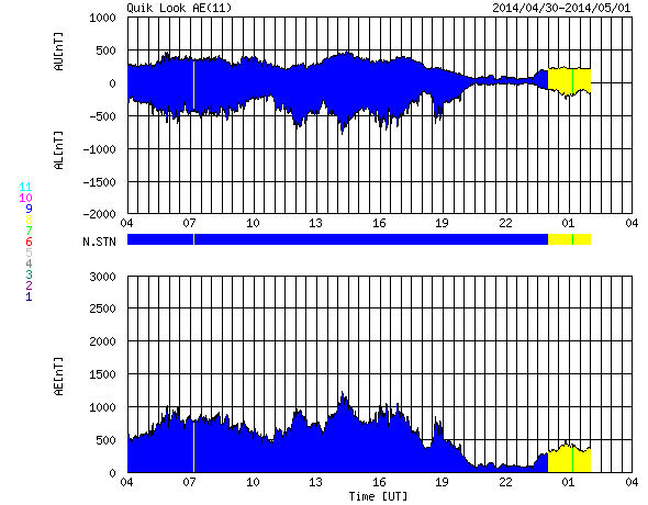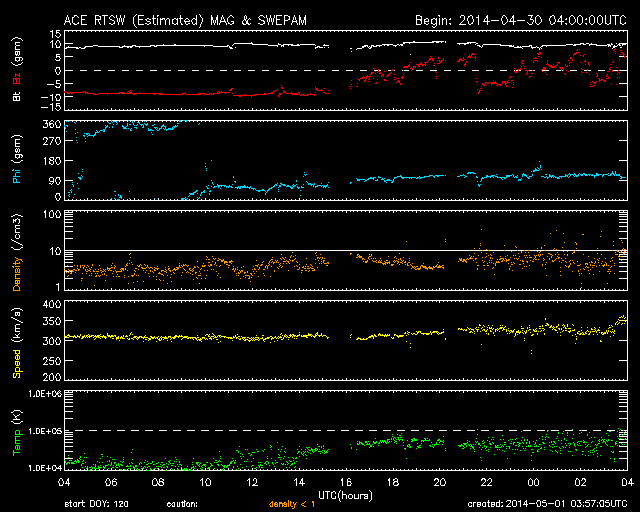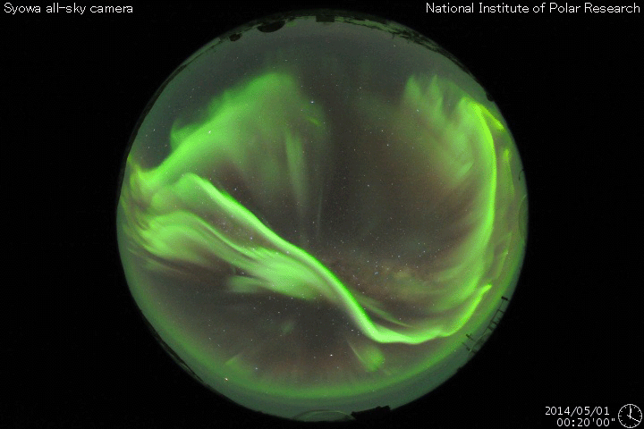 2014/ 5/ 1 12:57 更新 太陽風磁場の強い南向きは、夜半まで続きました。イエローナイフのオーロラをどうぞ。 担当 篠原 新宅宏章さんより、 カナダ・イエローナイフで撮影されたオーロラの写真をいただきました。 昨日のニュース以降の写真で、 太陽風磁場の強い南向きに関係したオーロラです。 新宅さんによると、イエローナイフは本格的に暖かくなりつつあり、 最低気温は0℃、最高気温は10℃を超えるくらいになっているそうです。 夜も短くなっていて、西空の夕焼けのオレンジ色が、 消えることなくそのまま北から東に移動するのが分かるそうで、 星が見えるのも3時間半くらいだそうです。 送っていただいた写真からもその雰囲気が感じられます。 観測時間が制限される中では、 今回の様な長時間の活動は素晴らしいチャンスだったと思います。 4月末の北半球のとても貴重なオーロラ写真を どうもありがとうございます。 現在の太陽風は、速度は310〜320km/秒と低速の状態が続いています。 昨日の朝から始まった磁場強度の強まりは、 現在も10nTと続いています。 一方、太陽風磁場の強い南向きは、 5月1日2時(世界時4月30日17時)頃に一旦終わって、 磁場は北向きになりました。 しかし、その後も磁場は南北にゆっくりと変化しています。 この太陽風磁場の変化を受けて、磁気圏の活動は大きく高まり、 AE指数のグラフは、図の中盤まで500〜1000nTと 中規模の変化が連続的に記録されています。 その後、一時的に変化がなくなり、 その後再び400nTと小規模の変化が発生しています。 この頃の南極のオーロラの様子を、 昭和基地の全天カメラの動画で紹介します。 カメラの半分を覆っていた霜が取り除かれ、 今日は全天のオーロラをじっくりと眺めることができます。 太陽風磁場の強まりは、今後次第に下がっていくでしょう。 そして、SDO衛星IA193にコロナホールが見られないため、 低速の穏やかな太陽風が続くと思われます。 太陽は、2049群と2050群で C1の小さいフレアが2回発生しています。 中央の2017群でも小さい活動は起きていて、 Cクラスのフレアはこの後も見られそうです。