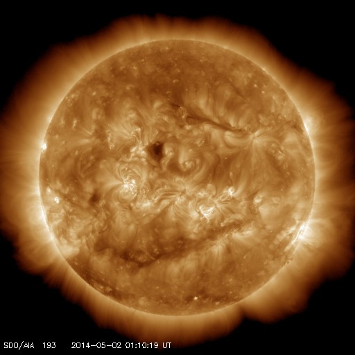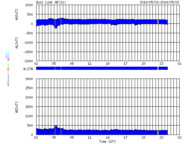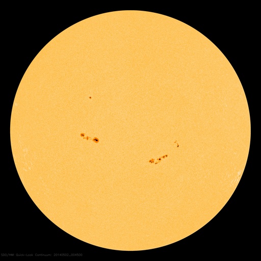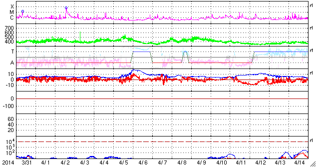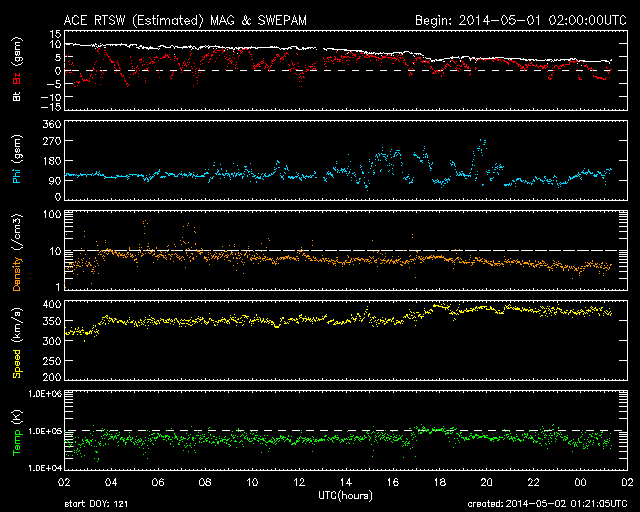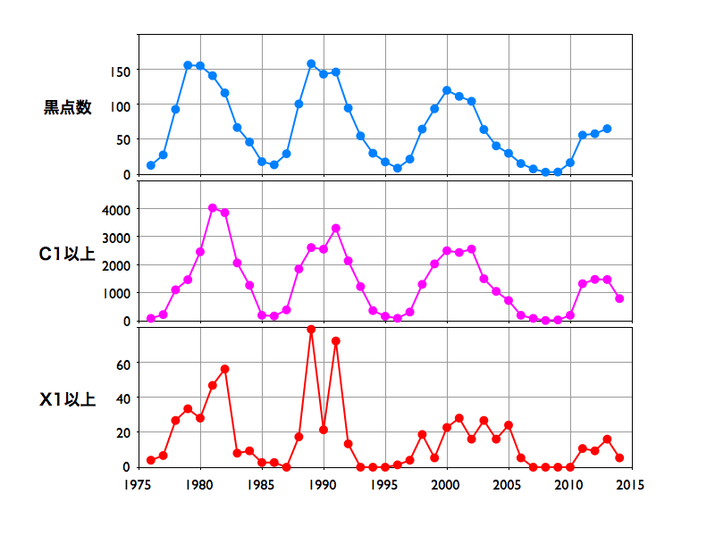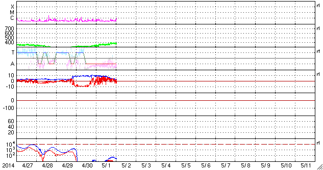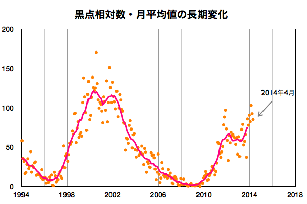 2014/ 5/ 2 10:21 更新 太陽風の磁場の強まりは終わりました。4月の黒点数は85でした。 担当 篠原 SIDCより、2014年4月の黒点相対数は 84.7 と発表されました。 2月に今期最高の102.8を記録した後、 3月の92.2に続く低下となりましたが、 グラフでは、4月のデータも大きな変化の幅の中にあります。 現在、第24活動周期は後半のピークを迎えています。 この後も極大の状態は続くのか、いよいよ低下が始まるのか、 半年、1年かけて見ていく変化ですが、興味深い点です。 また、2枚目の図で、 過去40年間のフレア発生数の推移をまとめました。 フレアの数は、NOAA/SWPCの報告を基に集計しています。 黒点数のグラフと並べているので、 太陽活動との対応に注目して下さい。 すると、現在の第24期は過去の3周期と比べて、 フレアの発生数が半分や3分の1程度であることが分かります。 その低い中でも、2011年から2013年にかけて発生数は高まっています。 最新の2014年のデータは、4月までの集計です。 まだ1年の3分の1なので、 フレアの発生頻度としては、昨年までと同程度と考えられます。 フレアの発生数は、黒点数の低下と共に大きく減ります。 長期的に考えれば、最近の様にフレアが多く見られる状態も、 それほど長く続かないと言えます。 太陽風の磁場強度は、昨日のニュース以降ゆっくりと低下して、 今日に入った頃に、5nTと平均的な状態に戻りました。 一方、太陽風の速度は一段上がって、 370km/秒とやや低速に変わっています。 磁場の南北成分は北寄りの傾向が続くようになり、 磁気圏も静かになっている様です。 今日のAE指数は、グラフがずっと太くなっていますが、 これは実際の変化ではなく、データエラーではないかと思います。 SDO衛星AIA193の太陽写真にコロナホールは見られず、 太陽風は穏やかな状態が続きそうです。 太陽では、2047群と2049群の2つの黒点群が目立っています。 また、2047群の右上に2051群が発生しています。 目立ったフレアの発生はありませんが、 SDO衛星の動画では、 2049群や2050群付近で小さい活動が頻繁に起きています。 今後、フレアの発生につながるかもしれません。