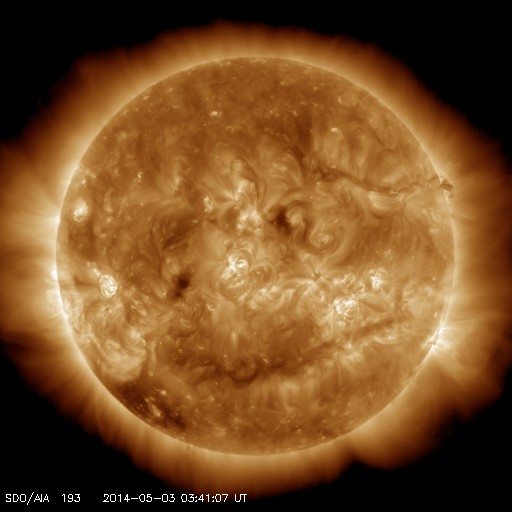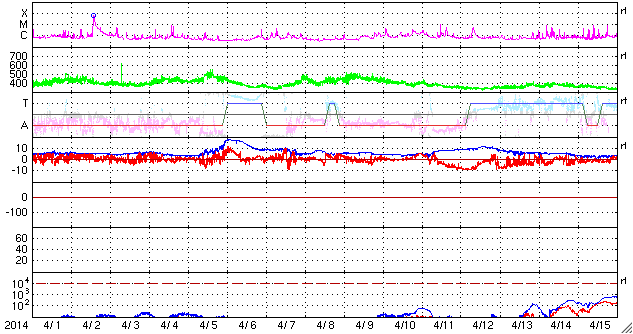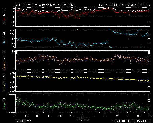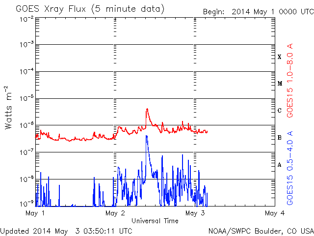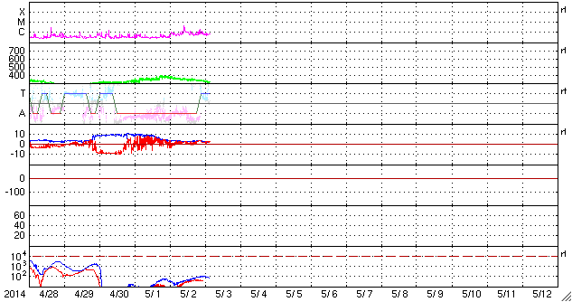 2014/ 5/ 3 12:54 更新 太陽でCクラスのフレアが増えています。ニュージーランドのオーロラをどうぞ。 担当 篠原 ニュージーランド・クィーンズタウンの米戸 実さんより、 太陽風磁場が長い時間南向きに強まった、 4月30日から5月1日にかけての夜に撮影された、 オーロラの写真をいただきました。 現地は秋も深まって、 朝方は氷点下になる季節となっているそうです。 この時の乱れは、ニュージーランドのお昼頃に始まっていて、 慌てて夕食を済ませて出かけ、 空が暗くなる頃に写真の湖沿いで撮影を始めることができたそうです。 昭和基地やイエローナイフと比べると、 より低い緯度からの撮影なので、 高い高度で輝いている赤いオーロラが目立ちます。 ほんとうに見事な輝きです。 上空には、大マゼラン雲、小マゼラン雲、 そして日本からは見えない南天の天の川も写っています。 2枚目の全天写真では、小さいですが南十字星も見えています。 とてもきれいな写真をありがとうございます。 「もっと太陽風が高速だったら」との米戸さんのコメントですが、 そうだったら、オーロラの領域が低緯度に広がって、 緑色のオーロラまで見えていたかもしれません。 現在の太陽風は、再び速度が下がって、 300km/秒とかなり低速の状態になっています。 磁場強度も3nTと弱くなっていて、太陽風は穏やかです。 磁場の南北成分は北寄りに推移しています。 このため、磁気圏は静穏で、 AE指数はデータエラーによって太くなっていますが、 磁気圏の活動を示すグラフの変動は全くありません。 SDO衛星AIA193の太陽写真にはコロナホールはなく、 太陽風は穏やかな状態が続きそうです。 太陽では、2051黒点群も大きくなり、 2047群、2049群とともに3つの黒点群が目立っています。 フレアは、2047群のC4.4を最高に、 3つの黒点群でC1〜2の小さいフレアが6回ほど起きています。 X線グラフの変化は小刻みに起きていて、 小さい活動が頻繁に起きているようです。 今後、より大きいフレアも発生するかもしれません。
