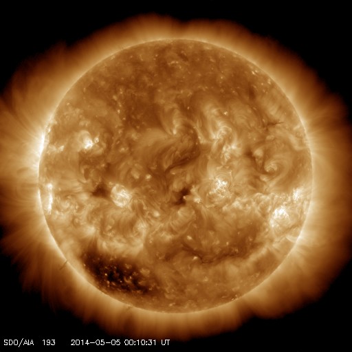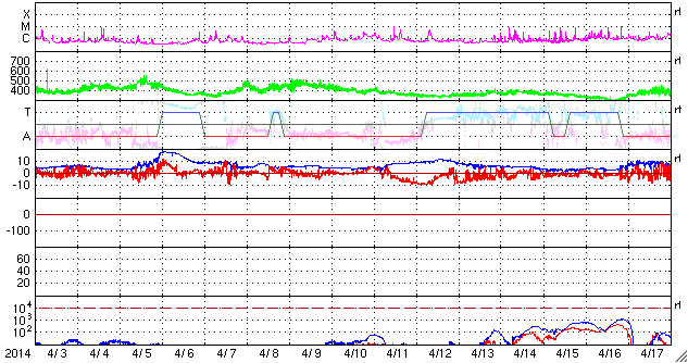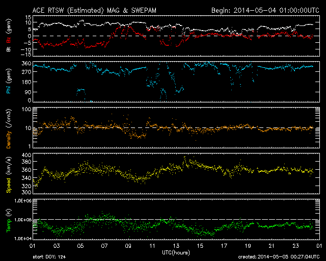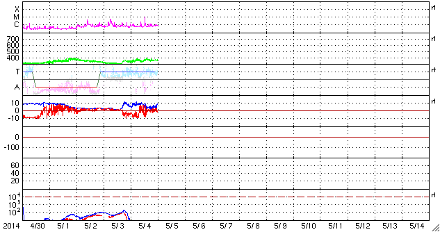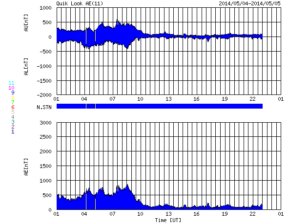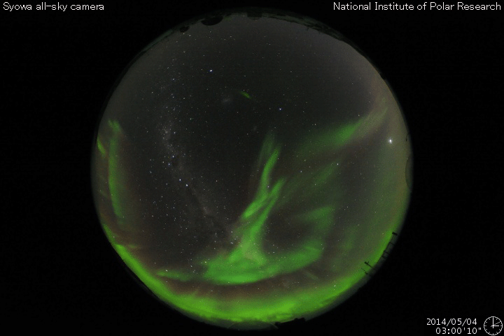 2014/ 5/ 5 09:28 更新 太陽風磁場の南向きは終わり、磁気圏は穏やかになっています。 担当 篠原 昨日のニュースを書いていた頃の世界時4日3時頃に、 南極の昭和基地で、夜明けを迎える空とオーロラの様子が とてもきれいに撮影されていました。 1時間ほどの様子を動画で紹介します。 写真を上から下へ横切る白い光の帯は天の川です。 30秒間隔の写真なので、 オーロラの動きは荒くなっていますが、 空全体の星が時計回りに動いている様子が分かります。 薄明が始まって、オーロラがその光の中に隠れていきます。 活発なオーロラの活動を引き起こしていた 太陽風磁場の-5nT程度の南向きは、 4日16時(世界時4日7時)頃に終わりました。 10nT近くに強まっていた磁場強度も 5nTを割るくらいに下がり、 太陽風磁場の変動は一先ず終わりました。 速度にはほとんど変化はなく、 360km/秒と低速の状態が続いています。 ただし、ACEデータの最後のところでは、 磁場強度は再び7nTへ少し上がっています。 更に高まるのか、5nT前後で推移していくのか、 この後の変化に注目して下さい。 磁気圏の活動も、太陽風磁場の南向きの終わりに合わせて、 AE指数の前半までで大きな変動は終わっています。 後半は小さな変化が見られる程度で、 磁気圏は穏やかになっています。 太陽では、西の端に近づいた2051黒点群で、 昨夜、4日21時(世界時4日12時)にC9.2と Mクラスに近い規模の小規模フレアが発生しました。 その他にも、2051群や北東の2053群で C1〜2の小さいフレアが6回ほど起きています。 東の端からは新しい黒点群が南北に顔を出しています。 これらはどの程度の活動度なのか注目して下さい。 ![]() 南極の昭和基地、世界時4日3時の夜明けを迎える頃のオーロラ。 (c) 国立極地研究所、(動画加工 : 宇宙天気ニュース) ![]() SDO衛星のAIA193カメラによる太陽コロナの様子 (c) SDO (NASA) ![]() SDO衛星による太陽の可視光写真。マウスの矢印を写真に重ねると、黒点番号付きの写真に切り替わります。 (c) SDO (NASA) ![]() GOES衛星の太陽X線データ (c) NOAA/SWPC ![]() ACEが観測した太陽風の磁場(1番上の枠、白線は全体の強度、赤線は南北成分) および、太陽風の密度(3番目の橙線)、速度(4番目の黄線) (c) NOAA/SWPC ![]() リアルタイムAE指数 下段のAEグラフの値が高くなると、オーロラ活動が活発化しています。 (c) 京都大学, NICT ![]() 27日の太陽周期に合わせたデータプロット 太陽が同じ面を地球に向けていた27日前の変化から、今後を予想することができます。 (c) 作図:宇宙天気ニュース