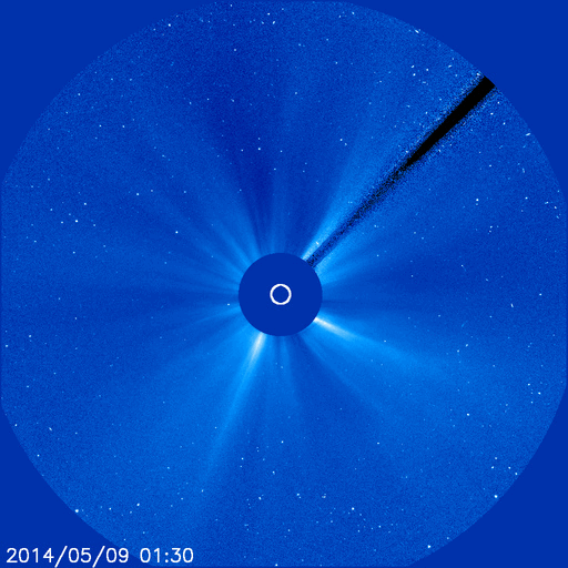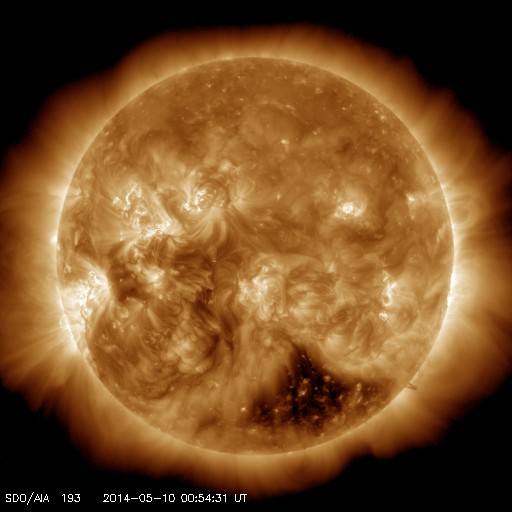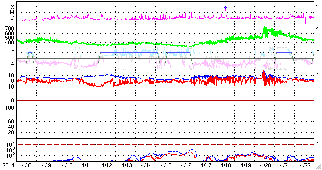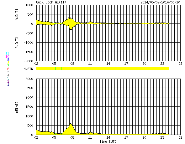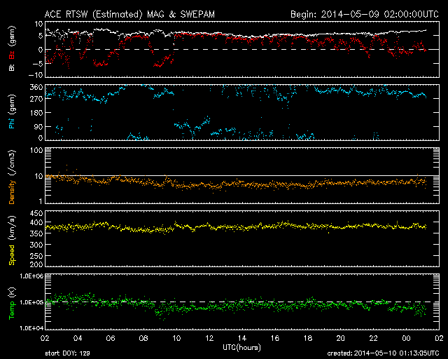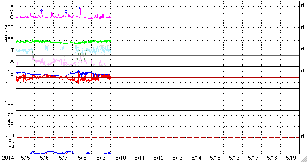 2014/ 5/10 10:12 更新 太陽風、磁気圏は穏やかです。ブリティッシュコロンビアのオーロラをどうぞ。 担当 篠原 高坂雄一さんより、 カナダ南西部のブリティッシュコロンビア州で 現地5月8日2時頃に撮影されたオーロラの写真をいただきました。 世界時では5月8日9時頃なので、 昨日のニュースで、 AE指数のグラフがとても大きく変化した頃のオーロラです。 ブリティッシュコロンビアは緯度が少し低いので、 磁気圏の活動が激しくなって、 オーロラの現れる地域が低緯度側に広がっていた様です。 高坂さんによると、この写真は裏庭からの撮影だそうです。 ピンクや緑のオーロラが動いていく様子がきれいです。 磁気圏の乱れ具合が感じられる興味深い写真を どうもありがとうございます。 現在の太陽風は、速度は380km/秒とやや低速、 磁場強度は7nTと少し強まった状態で安定しています。 磁場の南北成分は、グラフの前半は南寄り、 後半からは北寄りに切り替わっています。 磁気圏の活動も同様に切り替わっていて、 オーロラの活動度を示すAE指数のグラフは、 前半に600nTの山が発生していますが、 後半からは全く変化がなくなっています。 SDO衛星AIA193の太陽コロナ写真では、 南半球の高緯度域のコロナホールは、だいぶ西側に回っています。 今のところ太陽風への目立った影響はなく、 今回もこのまま静かに過ぎていくかもしれません。 太陽では、東端の2058黒点群の活動がやや高まっています。 昨夜は10日0時(世界時9日15時)にC7.8と大きい小規模フレアを起こし、 その前にも、C3.8、C3.3などCクラスのフレアを数回起こしています。 引き続き、活動に注目して下さい。 また、太陽の裏側で大きな活動が起きた様で、 SOHO衛星LASCO C3の写真で、 CME(太陽ガスの放出現象)が激しく広がっていました。 動画を掲載します。 太陽の向こう側に噴き出しているので、 地球への影響はありません。 ![]() カナダ南西部のブリティッシュコロンビア州で5月8日に撮影されたオーロラ。 (c) 高坂雄一氏 ![]() 太陽の裏側で発生したCME。SOHO衛星LASCO C3による。 (c) SOHO (ESA & NASA)、(動画加工 : 宇宙天気ニュース) ![]() SDO衛星のAIA193カメラによる太陽コロナの様子 (c) SDO (NASA) ![]() SDO衛星による太陽の可視光写真。マウスの矢印を写真に重ねると、黒点番号付きの写真に切り替わります。 (c) SDO (NASA) ![]() ACEが観測した太陽風の磁場(1番上の枠、白線は全体の強度、赤線は南北成分) および、太陽風の密度(3番目の橙線)、速度(4番目の黄線) (c) NOAA/SWPC ![]() リアルタイムAE指数 下段のAEグラフの値が高くなると、オーロラ活動が活発化しています。 (c) 京都大学, NICT ![]() 27日の太陽周期に合わせたデータプロット 太陽が同じ面を地球に向けていた27日前の変化から、今後を予想することができます。 (c) 作図:宇宙天気ニュース