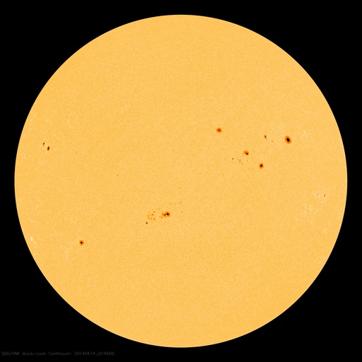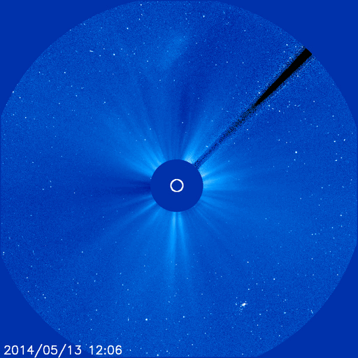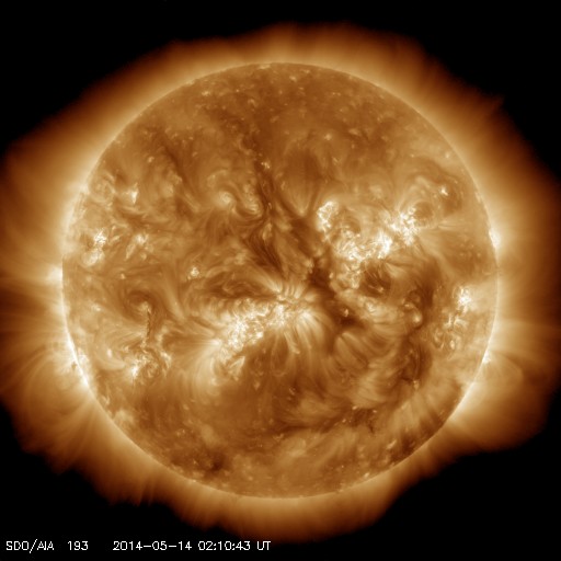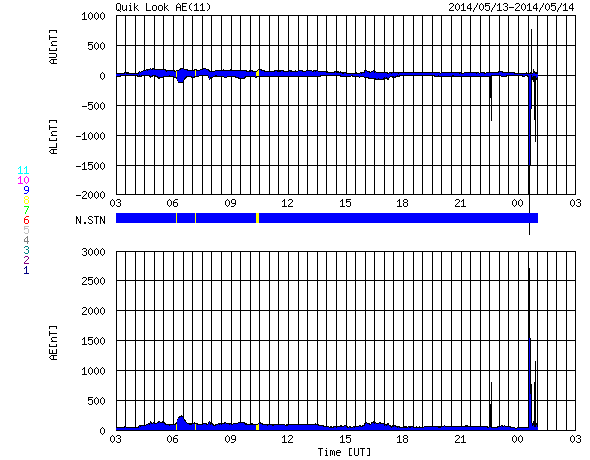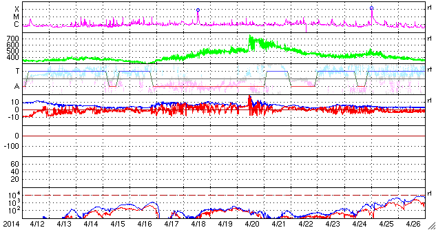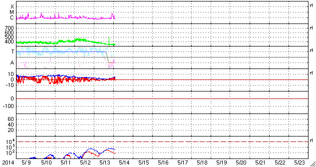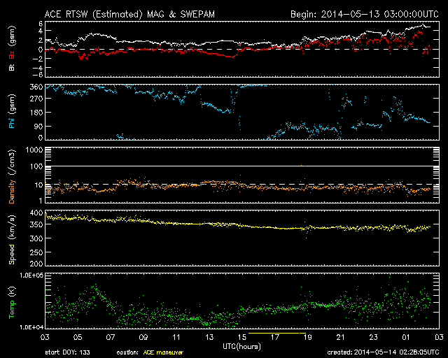 2014/ 5/14 11:29 更新 太陽風は低速で、磁気圏は穏やかです。 担当 篠原 太陽風の速度はもう一段下がって、 340km/秒と更に低速になっています。 磁場強度は、昨日いっぱいは 1nT近くまで弱まった状態が続きましたが、 今朝くらいから上がり初め、 現在は5nTと平均的な値に戻っています。 磁場強度の回復と共に、 太陽風磁場のセクターも 「T」から「A」へ切り替わっています(27日周期の図を参照)。 27日周期の前周期の図の様に、 これから太陽風の速度が上がって行くのか、 今回は低速のまま推移するのか、 今後の変化に注目して下さい。 磁気圏の活動は静穏で、AE指数はほとんど変化していません。 太陽では、今朝、14日7時(世界時13日22時)に、 北西の2056黒点群でC6.8の小規模フレアが発生しました。 その他は小さい活動が見られる程度です。 また、太陽の北東(左上)に新しい黒点群が出現しています。 SOHO衛星LASCO C3カメラの左上の端から、 プレアデス星団(すばる)が見え始めました。 夜空では冬に見られる星団ですが、 SOHO衛星の写真では毎年この時期に現れます。 これから半月ほどかけて、右へ横切っていきます。 ![]() SOHO衛星LASCO C3カメラの左上端に、プレアデス星団(すばる)が現れました。 (c) SOHO (ESA & NASA)、 (動画加工 : 宇宙天気ニュース) ![]() SDO衛星のAIA193カメラによる太陽コロナの様子 (c) SDO (NASA) ![]() SDO衛星による太陽の可視光写真。マウスの矢印を写真に重ねると、黒点番号付きの写真に切り替わります。 (c) SDO (NASA) ![]() ACEが観測した太陽風の磁場(1番上の枠、白線は全体の強度、赤線は南北成分) および、太陽風の密度(3番目の橙線)、速度(4番目の黄線) (c) NOAA/SWPC ![]() リアルタイムAE指数 下段のAEグラフの値が高くなると、オーロラ活動が活発化しています。 (c) 京都大学, NICT ![]() 27日の太陽周期に合わせたデータプロット 太陽が同じ面を地球に向けていた27日前の変化から、今後を予想することができます。 (c) 作図:宇宙天気ニュース