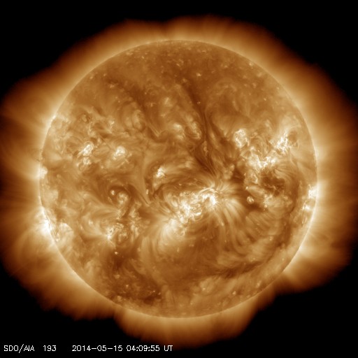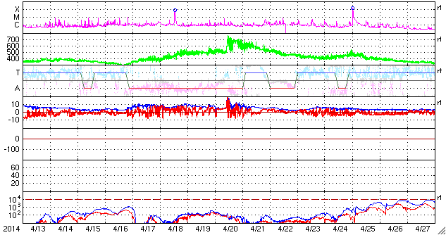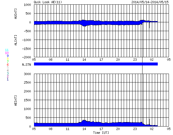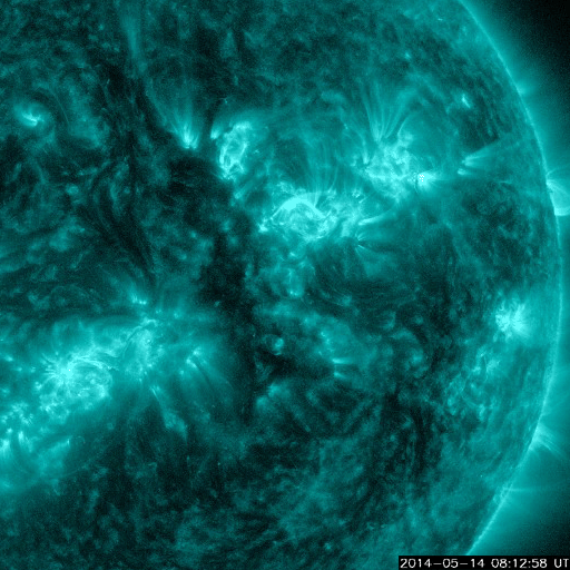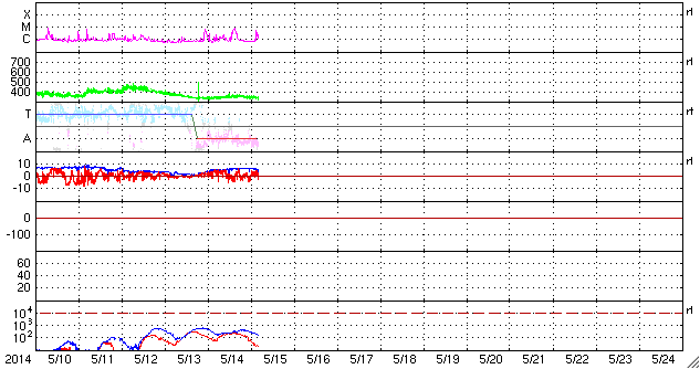 2014/ 5/15 13:17 更新 太陽風は低速の状態が続いています。C8やC5のフレアが発生しています。 担当 篠原 太陽風は、340km/秒と低速の風が続いています。 磁場強度も5nTと平均的な値で落ち着いています。 27日周期の図を見ると、 太陽風磁場のセクターは切り替わりましたが、 今回は速度の高まりは到来していません。 太陽風磁場の南北成分は、 0nTをはさんで、 南北に小さくゆっくりと振れています。 磁気圏の活動は穏やかで、AE指数は特に変化はしていません。 SDO衛星AIA193の太陽コロナ写真には、 特にコロナホールは見られず、 このまま穏やかな太陽風が続くのかもしれません。 太陽では、昨夜、14日22時(世界時14日13時)に、 2056黒点群でC8.3と大きいCクラスのフレアが発生し、 今日、15日11時半(世界時15日2時半)には、 2058黒点群でC5.0のフレアが発生しています。 フレアの様子を、SDO衛星AIA131の動画で紹介します。 太陽の東側に昨日現れた2063黒点群は、規模が少し大きくなり、 その隣りに2064黒点群が発生しています。 にぎやかな太陽面が続いています。 ![]() 2056黒点群のC8.3と2058黒点群のC5.0フレア。SDO衛星AIA131。 (c) SDO (NASA)、 (写真加工 : 宇宙天気ニュース) ![]() SDO衛星のAIA193カメラによる太陽コロナの様子 (c) SDO (NASA) ![]() SDO衛星による太陽の可視光写真。マウスの矢印を写真に重ねると、黒点番号付きの写真に切り替わります。 (c) SDO (NASA) ![]() ACEが観測した太陽風の磁場(1番上の枠、白線は全体の強度、赤線は南北成分) および、太陽風の密度(3番目の橙線)、速度(4番目の黄線) (c) NOAA/SWPC ![]() リアルタイムAE指数 下段のAEグラフの値が高くなると、オーロラ活動が活発化しています。 (c) 京都大学, NICT ![]() 27日の太陽周期に合わせたデータプロット 太陽が同じ面を地球に向けていた27日前の変化から、今後を予想することができます。 (c) 作図:宇宙天気ニュース
