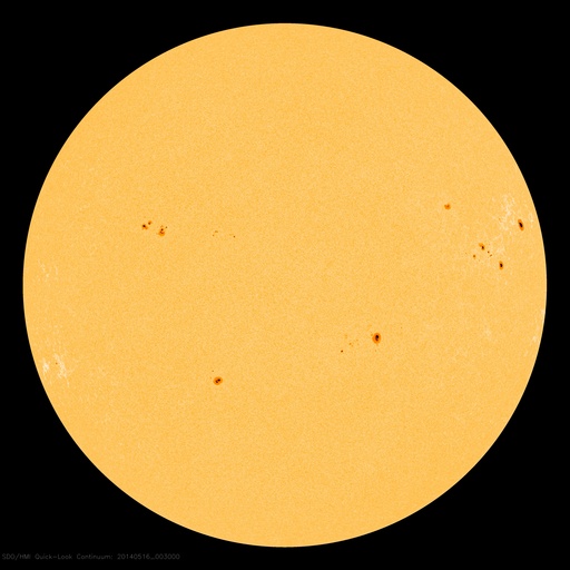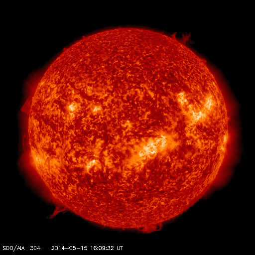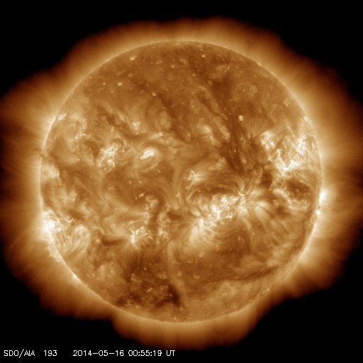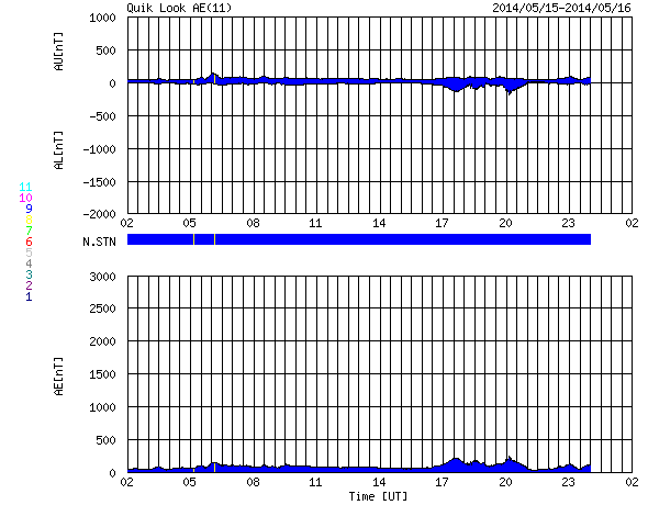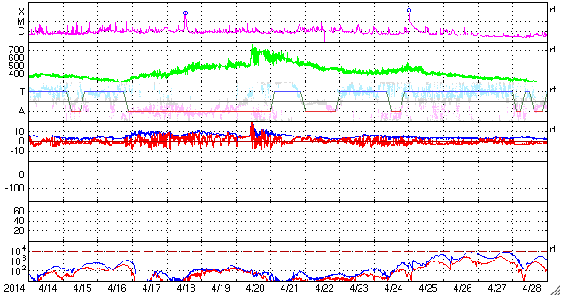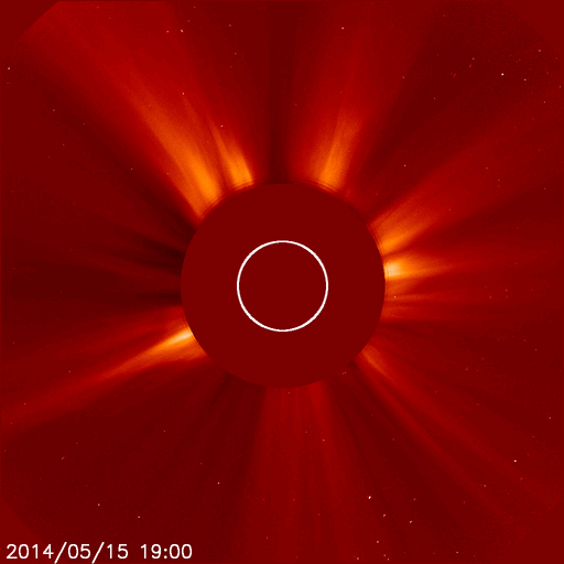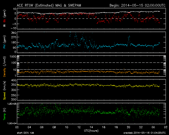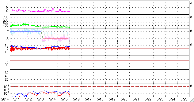 2014/ 5/16 10:05 更新 太陽の端でフィラメント噴出が発生しています。太陽風は低速で、磁気圏も穏やかです。 担当 篠原 今朝、16日5時(世界時15日20時)に、 太陽の南東の端(左下)で、 フィラメント噴出が発生しました。 SDO衛星AIA304による噴出の様子と、 続いてSOHO衛星LASCOカメラで撮影された CME(太陽ガスの放出現象)の様子を掲載します。 太陽の端で巨大なアーチが弾けるようにちぎれ、 白いガスが荒々しく噴き出しています。 地球からは横方向への噴出なので、影響はないでしょう。 昨日のニュース以降、 太陽ではC3のフレアが2回、C1のフレアが1回と、 小さい活動が時々起きている程度です。 黒点も、群の数は多いですが、特に発達した黒点はなく、 現状程度の活動が見られそうです。 太陽風は、340km/秒と低速の風が続いています。 磁場強度は、6nTから7nTと少し強まっています。 磁場の南北成分は概ね北寄りに推移していて、 磁気圏の活動は穏やかです。 AE指数は小さい変化が一時的に発生している程度です。 27日前の前周期とは変わって、 今回は太陽風は穏やかな状態が続きそうです。 また、SDO衛星AIA193のコロナ写真にはコロナホールはなく、 穏やかな太陽風はしばらく続きそうです。