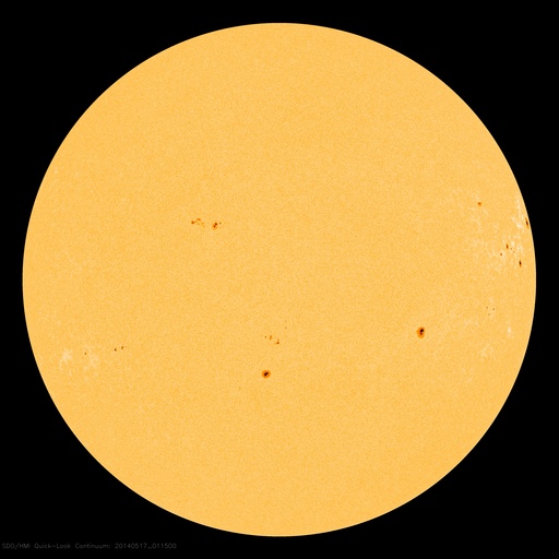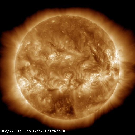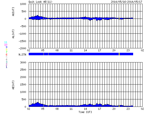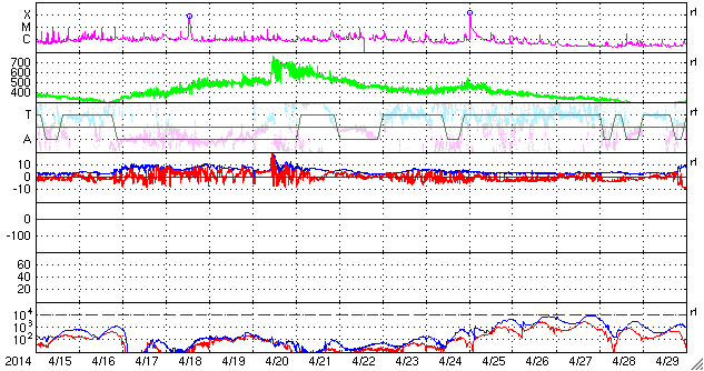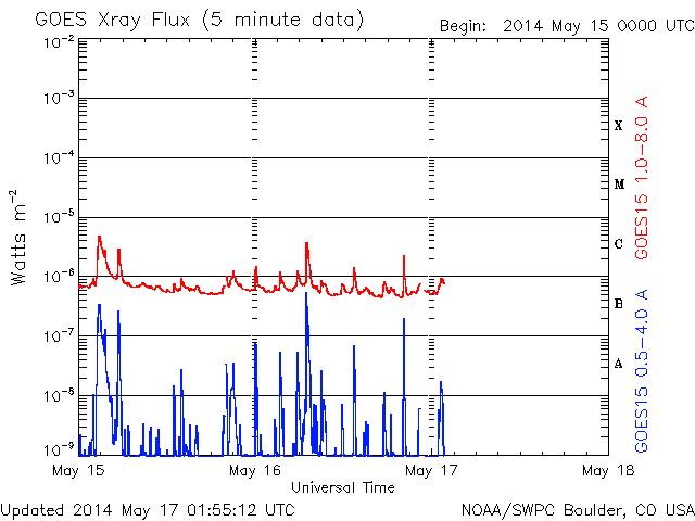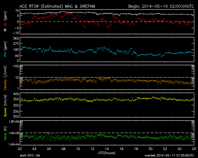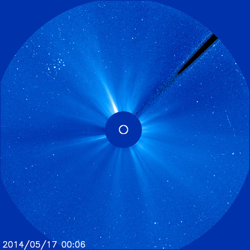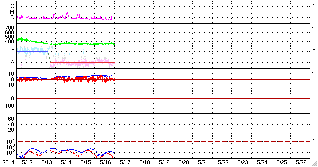 2014/ 5/17 10:55 更新 太陽風は低速で、磁気圏も穏やかです。 プレアデス星団がLASCO C3を通過中です。 担当 篠原 SOHO衛星LASCO C3カメラの左端に現れた プレアデス星団(すばる)は、 右へ向かって少しずつ移動しています。 星団全体の星の並びもきれいに見えていて、 ちょっとした宇宙望遠鏡を眺めている気分です。 1週間ほどすると、左下からおうし座の赤い目玉、 アルデバランが現れます。 太陽はおうし座を通過中です。 その太陽では、西の端に近づいた2056黒点群の フレアが増えています。 16日16時(世界時16日7時)のC5.7を最高に、 C1〜3の小さいフレアも3回ほど起きています。 一方、GOES衛星のX線写真の動画では、 北東の2063群や、2061群の北に新しくできた2066群の 小さい活動が目立っています。 今後はこれらの領域に注意が必要かもしれません。 太陽風は、340〜350km/秒と低速の状態で安定しています。 磁場強度も、6nTと平均的な強度が続いています。 このまま穏やかな太陽風が続きそうです。 磁場の南北成分は0nT付近で推移しています。 磁気圏の活動も概ね穏やかで、 AE指数は小さい変化が見られる程度です。 今日は電離圏観測用の短波レーダーの調整作業のため 九州大学に来ています。 ペルーに新しく設置する観測機材の準備と、 現在福岡で動かしているレーダーの調整です。 順調に進むといいのですが。