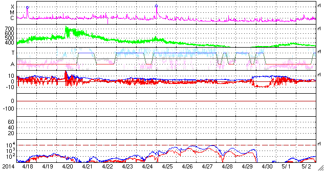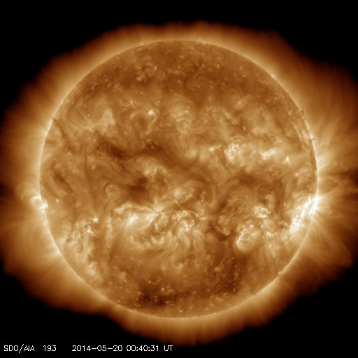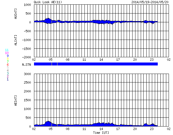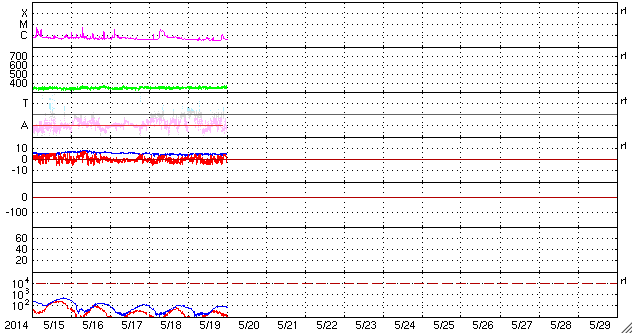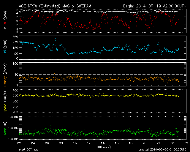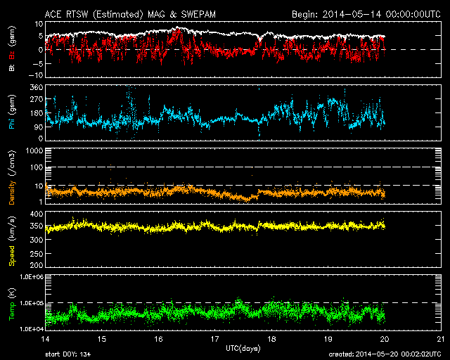 2014/ 5/20 10:00 更新 太陽風は350km/秒の低速風が1週間続いています。太陽も穏やかです。 担当 篠原 太陽風は、350km/秒と低速の状態が安定して続いています。 磁場強度も、5nTと平均的な値が続いています。 ACE衛星のグラフは、 昨日の図と今日の図の区別がつかないくらいです。 7日幅のACEのグラフを1枚目に掲載します。 6日分のデータが表示されていますが、 速度の黄色線は、ほとんど横に一直線です。 太陽風磁場の南北成分は、南や北に揺れています。 磁気圏では弱い活動が時々起きていて、 AE指数には200nT程度の小さい変化が見られます。 SDO衛星AIA193の太陽写真は、 全体にもやもやとコロナのガスが広がっていて、 コロナホールの暗い広がりは特に見られません。 27日周期の図の前周期の太陽風も、 4月24〜25日に速度の小さい高まりがありますが、 その後は低速の風がずっと続いています。 今回もこのまま当分、速度の遅い太陽風が続くかもしれません。 この様な長期的な変化にも注目して下さい。 太陽は、東端(左端)に新しく姿を現した2071黒点群で C1.2の小さいフレアが起きましたが、 全体としては穏やかな状態が続いています。 東端の新しい領域は、どの程度の活動度でしょうか。 ![]() ACEによる、7日幅の太陽風の変化。速度(黄色線)がほとんど一直線になっています。 (c) NOAA/SWPC ![]() SDO衛星のAIA193カメラによる太陽コロナの様子 (c) SDO (NASA) ![]() SDO衛星による太陽の可視光写真。マウスの矢印を写真に重ねると、黒点番号付きの写真に切り替わります。 (c) SDO (NASA) ![]() ACEが観測した太陽風の磁場(1番上の枠、白線は全体の強度、赤線は南北成分) および、太陽風の密度(3番目の橙線)、速度(4番目の黄線) (c) NOAA/SWPC ![]() リアルタイムAE指数 下段のAEグラフの値が高くなると、オーロラ活動が活発化しています。 (c) 京都大学, NICT ![]() 27日の太陽周期に合わせたデータプロット 太陽が同じ面を地球に向けていた27日前の変化から、今後を予想することができます。 (c) 作図:宇宙天気ニュース