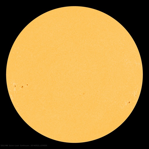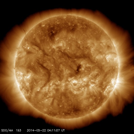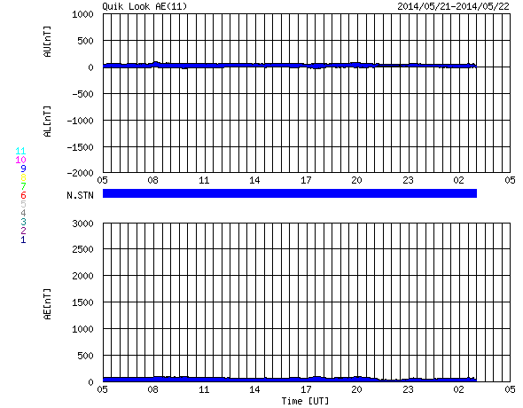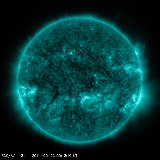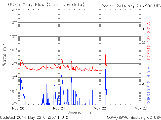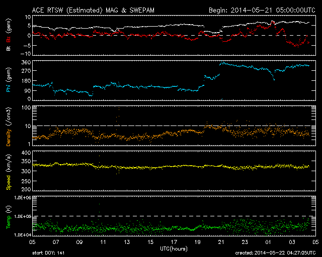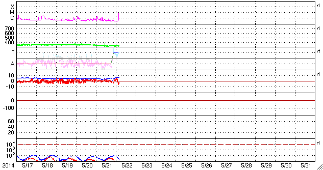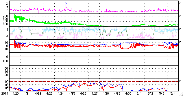 2014/ 5/22 13:27 更新 C6.4の小規模フレアが発生しました。太陽風は低速風が続いています。 担当 篠原 今日の昼、22日12時(世界時22日3時)に、 太陽の中央部の2072黒点群で、 C6.4とやや大きいCクラスの小規模フレアが発生しました。 SDO衛星AIA131の動画を掲載します。 明るい輝きが短時間で終わるタイプのフレアです。 CMEの発生は伴っていない様に思われます。 太陽では、東の端に2073黒点群が現れています。 しかし、特にフレアの活動を起こす様子は見られません。 太陽風は、速度が330km/秒から310km/秒へ更に下がっています。 磁場強度は6nTと、強さは特に変わっていませんが、 27日周期の図を見ると、 太陽風磁場のセクターが切り替わったようです。 今回の切り替わりでは、 太陽風の速度や磁場強度に目立った変化は起きていません。 磁気圏の活動も穏やかで、 AE指数のグラフは全く変化していません。 太陽風の低速状態は、一段と深まってきました。 27日前の前周期の太陽風も、このまま遅い状態が続いています。 今回も穏やかな風が続きそうです。