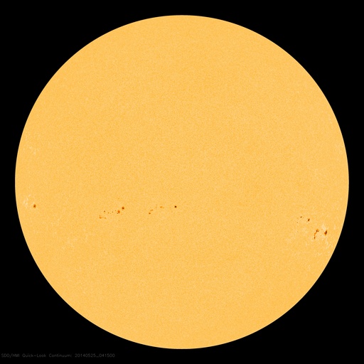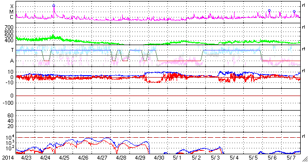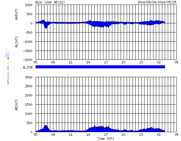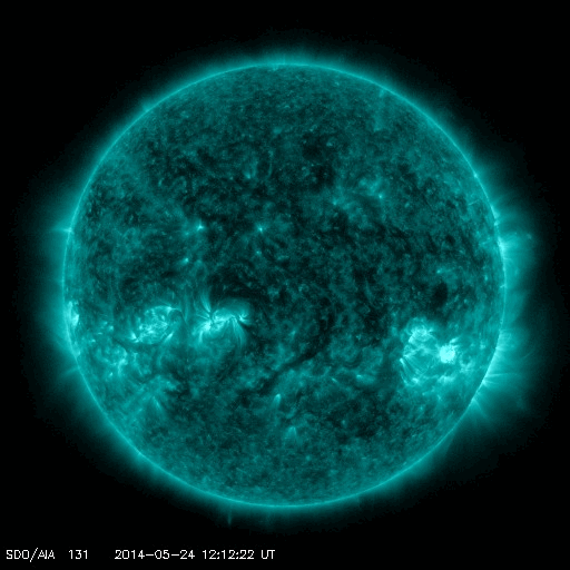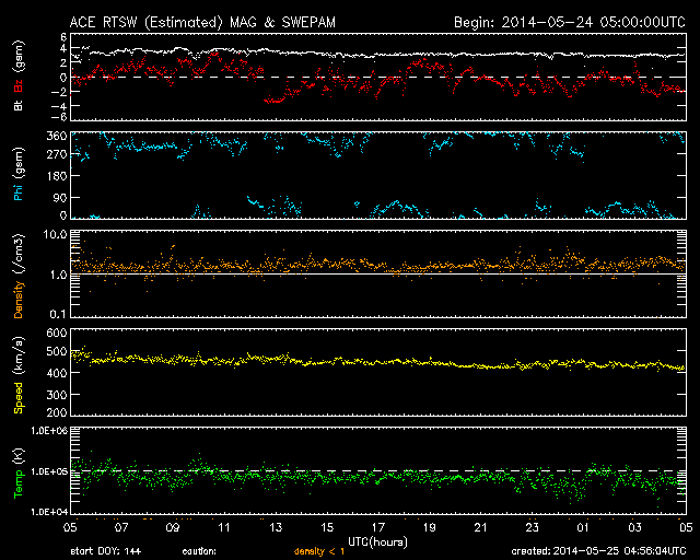 2014/ 5/25 13:56 更新 太陽風速度の高まりは終わりました。M1.2の中規模フレアが発生しました。 担当 篠原 太陽風は、450km/秒とやや高速の状態から ゆっくりと下がって、現在は430km/秒です。 磁場強度は、3nTに弱まっています。 磁場の南北成分は、 ACEの図の前半はやや北寄りですが、 中盤以降はやや南寄りになっています。 その影響で、AE指数は後半に200nT程度の 小さい変化が発生しています。 太陽風は、この後も速度は次第に下がって、 低速風になりそうです。 太陽では、25日3時半(世界時24日18時半)に、 南西(右下)の2065黒点群でM1.2の中規模フレアが発生しました。 2065群では、この他にも C1の小さいフレアが8回発生しています。 2065群は、可視光写真でも黒点が大きくなっています。 この後も同程度のフレアを起こすかもしれません。 ![]() SDO衛星AIA131による、2065黒点群で発生したM1.2のフレア。 (c) SDO (NASA)、 (動画加工 : 宇宙天気ニュース) ![]() SDO衛星のAIA193カメラによる太陽コロナの様子 (c) SDO (NASA) ![]() SDO衛星による太陽の可視光写真。マウスの矢印を写真に重ねると、黒点番号付きの写真に切り替わります。 (c) SDO (NASA) ![]() ACEが観測した太陽風の磁場(1番上の枠、白線は全体の強度、赤線は南北成分) および、太陽風の密度(3番目の橙線)、速度(4番目の黄線) (c) NOAA/SWPC ![]() リアルタイムAE指数 下段のAEグラフの値が高くなると、オーロラ活動が活発化しています。 (c) 京都大学, NICT ![]() 27日の太陽周期に合わせたデータプロット 太陽が同じ面を地球に向けていた27日前の変化から、今後を予想することができます。 (c) 作図:宇宙天気ニュース
