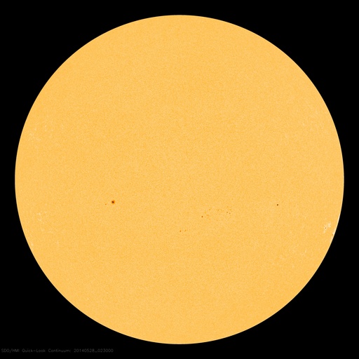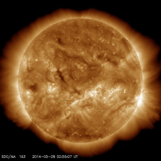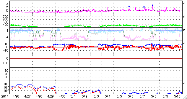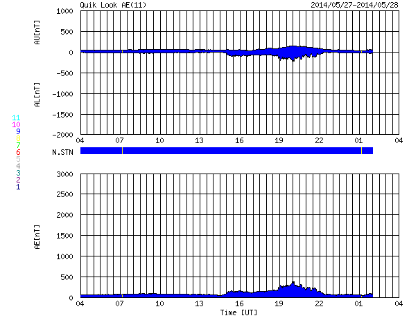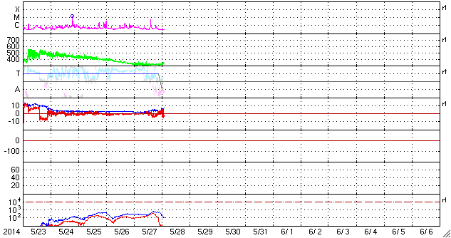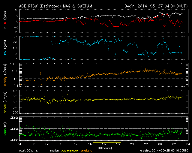 2014/ 5/28 12:09 更新 太陽風は300km/秒台前半の低速風です。太陽も静かになっています。 担当 篠原 低速の太陽風が続いています。 速度は320km/秒から340km/秒へ少し上がった程度です。 昨日、2nTに弱まっていた磁場強度は、 昨夜から変化が始まって、 現在は6nT程度と平均的な値に戻っています。 27日周期の図を参照すると、 太陽風磁場の大まかな方向が切り替わる セクター境界が来ていた様です。 磁気圏も概ね静穏で、 AE指数のグラフは、太陽風磁場がばたついていた後半に 小さい変化が起きている程度です。 現在の太陽風磁場の南北成分は、 0nTを挟んで南北に振れています。 南寄りになった時には この様な小規模の活動が見られそうです。 SDO衛星AIA193の太陽コロナ写真には、 今日もコロナホールは見られませんが、 この後、南東の端(左下)からコロナホールが現れそうです。 太陽では、西の端でC4.9とC1.7の小規模フレアが起きていますが、 活動的な領域は西に沈んで、今後は見えなくなります。 残った黒点群では、中央西寄りの2071群で C1.1の小さいフレアが発生した程度で、 太陽は一段と静かになりそうです。