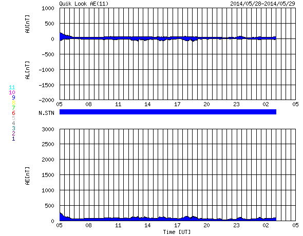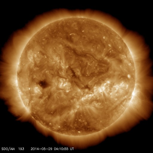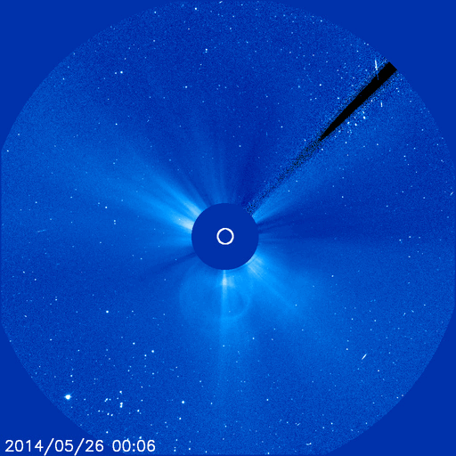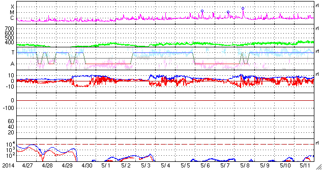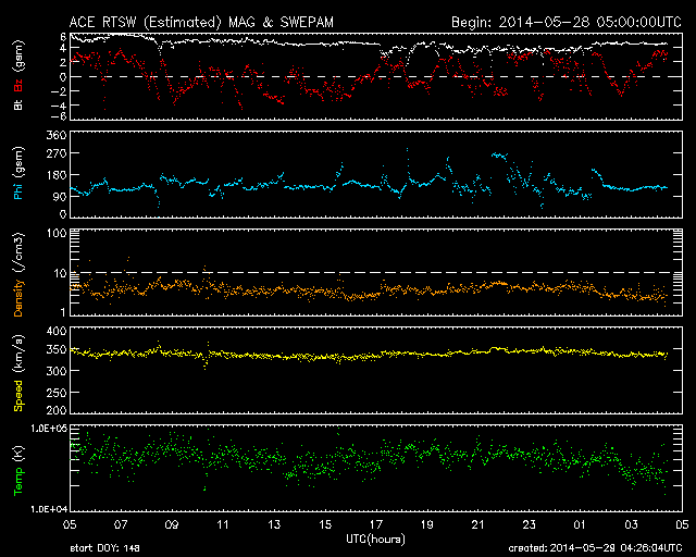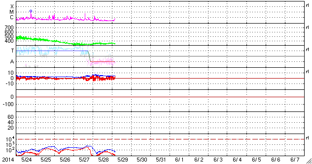 2014/ 5/29 13:27 更新 太陽風は低速で、磁気圏も穏やかです。プレアデス星団が消えていきました。 担当 篠原 SOHO衛星LASCO C3カメラの右上の端から、 プレアデス星団(すばる)が消えていきました。 2週間前の5月13日に姿を現して以来、 少しずつ横に移動して行き、 今日の昼にとうとう消えていきました。 最後の写真の下半分には、 おうし座の頭部にあたる、 V字を左に傾けた様な星の並びが見えています。 その中の一番明るい星は、アルデバランという一等星です。 プレアデス星団がSOHOの写真を通り過ぎると、 いよいよ初夏を迎える感じがします(鹿児島では)。 太陽風の速度は、340km/秒のままほとんど変わらず、 低速風が安定して続いています。 磁場強度も、5nTと平均的な状態が続いています。 磁場の南北成分は、南北に小さく振れている程度で、 速度が遅いこともあり、磁気圏は穏やかです。 AE指数はほとんど変化が見られません。 太陽では、中央部の少し右下に2076黒点群が出現しています。 B7の小さいフレアを起こしていますが、 活動的な様子ではありません。 その他にも特にフレアは起きていないのですが、 GOES衛星のX線写真では、 東端(左端)の向こう側の活動的な領域がちらちらと見えています。 今後、どのような領域が姿を現すでしょうか。 ![]() SOHO衛星LASCO C3カメラの右上端からプレアデス星団(すばる)消えていきました。 (c) SOHO (ESA & NASA)、 (動画加工 : 宇宙天気ニュース) ![]() SDO衛星のAIA193カメラによる太陽コロナの様子 (c) SDO (NASA) ![]() SDO衛星による太陽の可視光写真。マウスの矢印を写真に重ねると、黒点番号付きの写真に切り替わります。 (c) SDO (NASA) ![]() ACEが観測した太陽風の磁場(1番上の枠、白線は全体の強度、赤線は南北成分) および、太陽風の密度(3番目の橙線)、速度(4番目の黄線) (c) NOAA/SWPC ![]() リアルタイムAE指数 下段のAEグラフの値が高くなると、オーロラ活動が活発化しています。 (c) 京都大学, NICT ![]() 27日の太陽周期に合わせたデータプロット 太陽が同じ面を地球に向けていた27日前の変化から、今後を予想することができます。 (c) 作図:宇宙天気ニュース