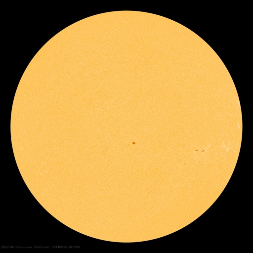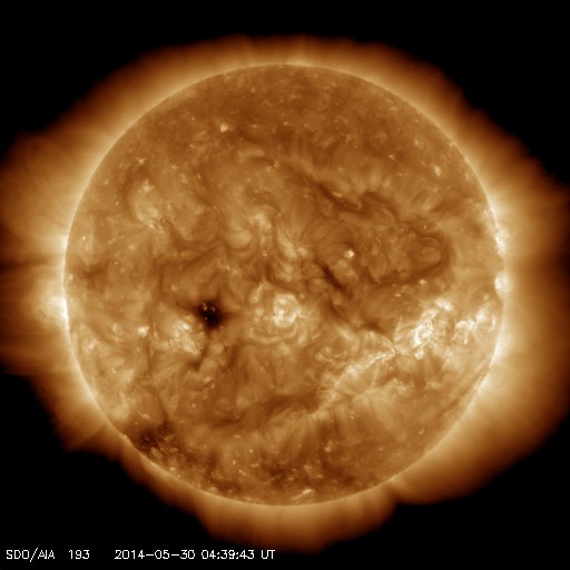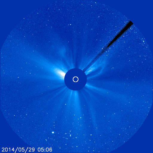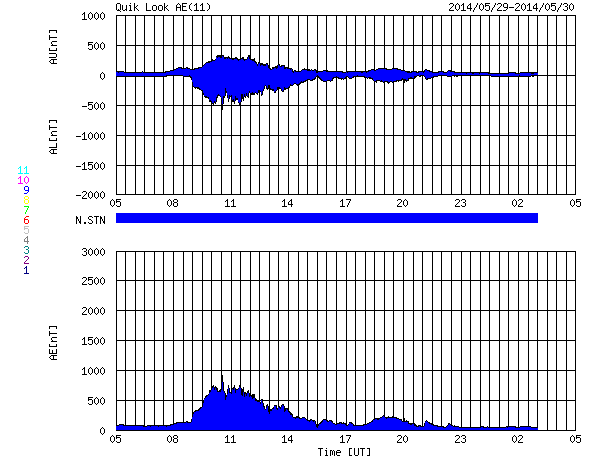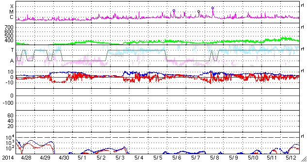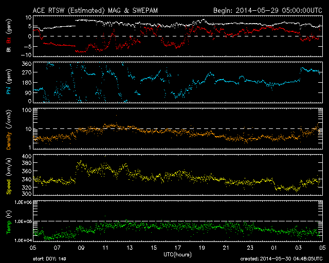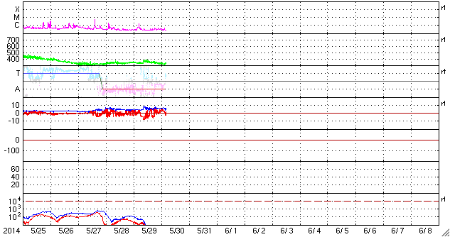 2014/ 5/30 13:48 更新 太陽風の磁場が南向きに振れて、磁気圏の活動がやや高まりました。 担当 篠原 昨日のニュースの直後から太陽風磁場が南向きに振れ、 -5nT前後とある程度の強さを持った南向きの状態が、 途中途切れたりしながらですが、7時間ほど続きました。 太陽風の速度は350km/秒と低速でしたが、 磁気圏の活動はある程度高まり、 AE指数は、最大700nTに達する中規模の活動が 5時間ほど発生しています。 その後、磁場は北向きに変わり、 現在の磁気圏は穏やかです。 一時的な乱れは到来しましたが、 太陽風は低速で穏やかな状態が続きそうです。 太陽では、東端の裏側でフレアなどの現象が発生した様で、 SOHO衛星LASCO C3カメラでは、 CME(太陽ガスの放出現象)が左上に向かって激しく 噴き出しています。 GOES衛星のX線カメラでも、東端に明るい領域が現れ始めていて、 この後黒点群などが回ってくるかもしれません。 こちら側のフレア活動は穏やかで、 目立ったフレアは、C1の小さいものが1回発生した程度です。 ![]() 太陽の東端の向こう側で発生したCMEの様子。SOHO衛星LASCO C3による。 (c) SOHO (ESA & NASA)、 (動画加工 : 宇宙天気ニュース) ![]() SDO衛星のAIA193カメラによる太陽コロナの様子 (c) SDO (NASA) ![]() SDO衛星による太陽の可視光写真。マウスの矢印を写真に重ねると、黒点番号付きの写真に切り替わります。 (c) SDO (NASA) ![]() ACEが観測した太陽風の磁場(1番上の枠、白線は全体の強度、赤線は南北成分) および、太陽風の密度(3番目の橙線)、速度(4番目の黄線) (c) NOAA/SWPC ![]() リアルタイムAE指数 下段のAEグラフの値が高くなると、オーロラ活動が活発化しています。 (c) 京都大学, NICT ![]() 27日の太陽周期に合わせたデータプロット 太陽が同じ面を地球に向けていた27日前の変化から、今後を予想することができます。 (c) 作図:宇宙天気ニュース