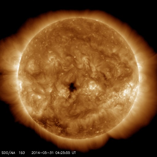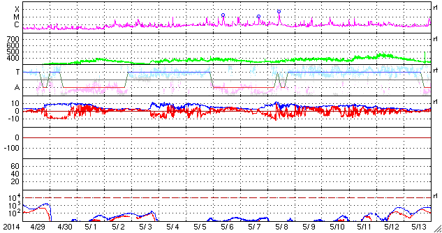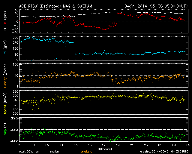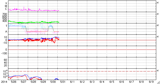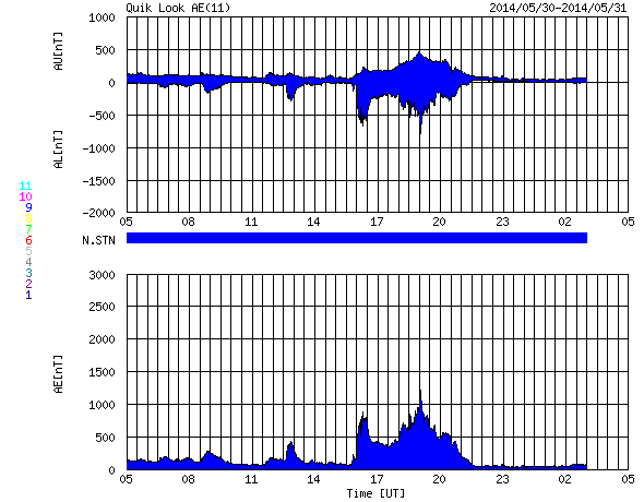 2014/ 5/31 13:35 更新 太陽風磁場が南向きに強まって、磁気圏の活動が高まりました。 担当 篠原 昨夜から太陽風磁場の乱れが到来し、 一時的に磁気圏の活動が強まりました。 ACE衛星の観測によると、昨夜、30日22時(世界時30日13時)頃から 太陽風に磁場の乱れが到来した様で、 磁場強度が5nTから7nTに一段上がり、 その後、更に高まって、10nTをやや超えるくらいに強まりました。 一方、太陽風の速度には目立った変化はなく、 340〜350km/秒と遅い状態が続いています。 磁場の変化が始まった直後から、南北成分は南向きに振れ、 -5nTから、その後-10nTにまで強まっています。 この影響で、磁気圏の活動も強まり、 AE指数は、31日1時(世界時30日16時)頃から 800nTから、一時的に1000nTに届く活動が5時間ほど発生しています。 極域ではオーロラのきれいな活動が見られたのではないでしょうか。 磁気圏の活動が止まったのは、 31日4時(世界時30日19時)以降、 太陽風磁場が北向きに切り替わったためです。 太陽風から磁気圏へのエネルギーの流れ込みが止まって、 AE指数のグラフの右側は、全く変化しなくなっています。 太陽風の磁場強度は、現在も10nTに強まったままです。 再び、南北成分が南向きに大きく振れると、 磁気圏の活動も高まるでしょう。 SDO衛星AIA193の太陽コロナ写真では、 中央に小さくコロナホールの黒い穴が見えています。 規模が小さいので、大きな影響は来ないと思われますが、 目立った構造はこのくらいで、穏やかな太陽風が続きそうです。 目立ったフレアの発生もなく、 GOES衛星のX線のグラフは平坦になっています。 東の端から2077黒点群が姿を現していますが、 特に動きはありません。