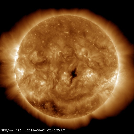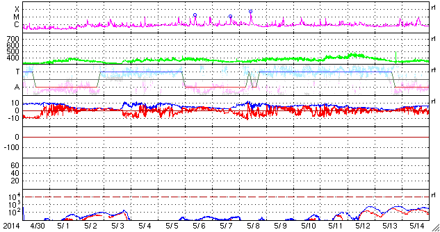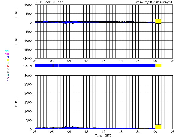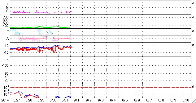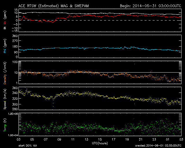 2014/ 6/ 1 11:55 更新 太陽風は一段と低速になっています。太陽の東端で小規模フレアが起きています。 担当 篠原 太陽風は、速度が340km/秒から310km/秒へ下がり、 更に低速の風になっています。 10nTに強まっていた磁場強度は、ゆっくりと低下していますが、 まだ7nTと少し強めです。 磁気圏への影響度を決める太陽風磁場の南北成分は、 北向きの傾向が続いています。 このため、磁気圏の活動はとても穏やかで、 AE指数は、ほとんど変化していません。 SDO衛星AIA193の太陽コロナ写真では、 小さいコロナホールが中央をちょうど通過したところです。 暗い領域の広がりは小さいので、地球への影響は小さそうで、 3日後くらいの太陽風に弱い乱れが見られるかもしれませんが、 基本的には穏やかな太陽風が続きそうです。 太陽では、中央の左下寄りと東端に新しい黒点が現れています。 東端の黒点群では、先ほど、6月1日10時半(世界時1日1時半)に C2.4の小規模フレアが発生しました。 X線カメラの動画を見ると、 この領域ではその前にもフレアの活動が起きている様です。 今後の活動に注目してください。