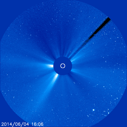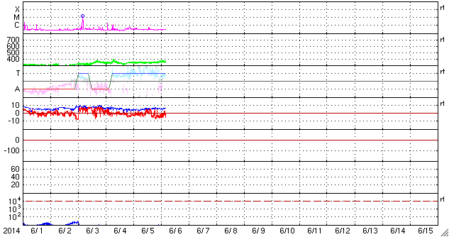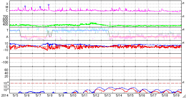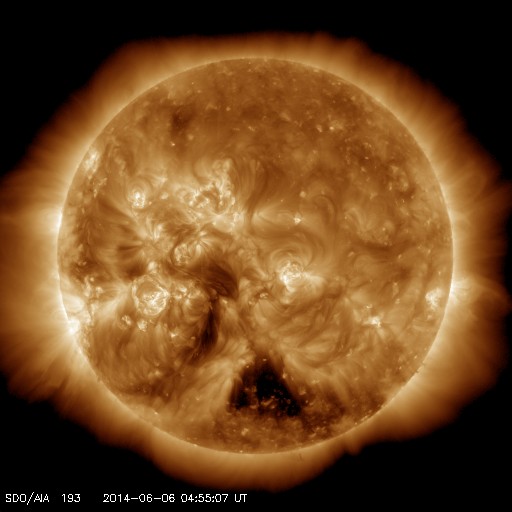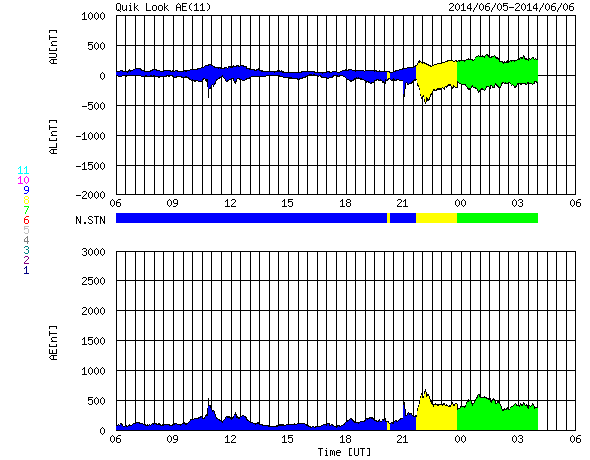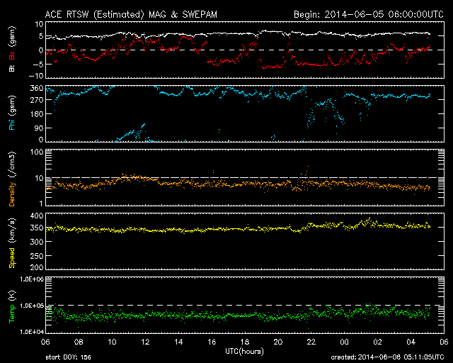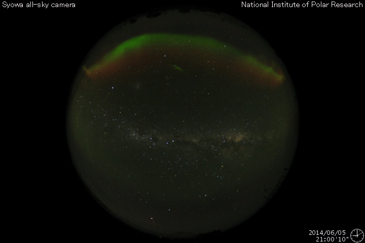 2014/ 6/ 6 14:11 更新 太陽風は低速ですが、磁場の南向きでオーロラが少し強まっています。 担当 篠原 昨日発生した、フィラメント噴出によって発生したCMEの様子を、 SOHO衛星LASCO C3の動画で紹介します。 これを見ると、CMEのガスは左下を中心に噴き出していますが、 一部が淡く太陽を包む様に広がっています。 このため、CMEの一部は地球の方向に向かっているかもしれません。 その場合、発生から到来まで4〜5日程度と考えると、 6月9〜10日くらいに太陽風の弱い乱れがやって来るかもしれません。 磁場の強まりが流れてくると、 オーロラの活動が高まる可能性もあります。 現在の太陽風は、速度は350km/秒と低速、 磁場強度は5nTと平均的な値で、それぞれ安定しています。 ACEの図の中程から、磁場の南北成分が南向きにやや強まり、 磁気圏のオーロラ活動を高めています。 AE指数は、後半から500nTの中規模の変化が続いています。 その始まりの頃にあたる、6日6時(世界時5日21時)の 昭和基地のオーロラの動画を掲載します。 それまで暗かった空が、急にオーロラの光で満たされます。 今日のSDO衛星AIA193の写真では、 太陽の南半球のコロナホールは、 三角形を描くように低緯度側にせり出しています。 このくらいになると、地球へも影響がやって来そうです。 太陽は、東に2082黒点群、西に2083黒点群と 黒点が新しく出現していますが、 フレアの発生はなく、活動は穏やかです。