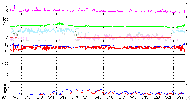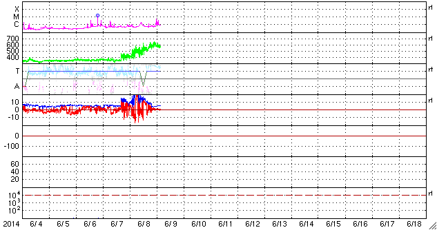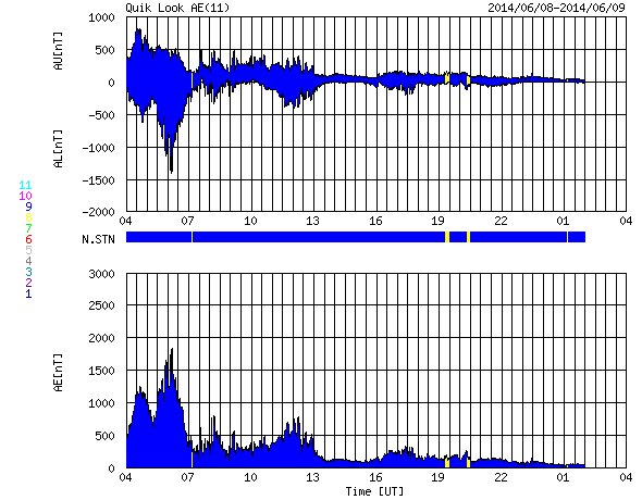 2014/ 6/ 9 12:22 更新 太陽風は600km/秒の高速風になっています。アメリカ・ノースダコタのオーロラをどうぞ。 担当 篠原 アメリカ合衆国ノースダコタ州 グランドフォークスの大関翔輝さんより、 現地8日3〜4時に撮影されたオーロラの写真をいただきました。 ノースダコタ州は、アメリカ中北部のカナダに接するところで、 オーロラ帯よりも南に離れた地域です。 撮影は、太陽風の磁場が大きく南向きに振れて(-15nT)、 磁気圏の活動が激しくなったすぐ後の時間帯です。 AE指数のグラフを見ると、世界時8日6時頃に、 1800nTに達する激しい変化を記録しています。 大関さんの写真は、この変動に続くオーロラの活動を捉えています。 大関さんからは、2月21日にもオーロラの写真を 送っていただいているのですが、 その時と同じく、磁気圏の活動が激しくなって、 オーロラの輝く領域が低緯度側に大きく広がっていたのでしょう。 参考までに、前回、2月のオーロラの時は、 太陽風の磁場南北成分は -15nT、速度は470km/秒でした。 そして、今回の太陽風は、磁場の南北成分は-15nT、 速度は500km/秒と、同じような値を記録しています。 写真の背景の星空に目を向けると、 1枚目の写真は上端にカシオペヤ座、 2枚目の写真は真ん中に北斗七星が写っています。 アメリカの踏切もとても素敵です。 太陽風擾乱時の興味深い写真を、どうもありがとうございます。 昨日のニュース以降、 太陽風の速度は600km/秒に上がって、 完全に高速太陽風に変わっています。 一方、磁場強度は下がって、5nTと平均的な値に戻っています。 磁場の南北成分は、比較的北寄りに振れているようです。 このため、磁気圏の活動は一段落していて、 AE指数の変化は、 前半に1000nTを超える激しい変化が見られますが、 中盤以降は小さい変化に留まっています。 SDO衛星AIA193では、南半球側のコロナホールは、 次第に遠ざかっています。 今回の太陽風の乱れは、 この領域の影響だったのではないでしょうか。 太陽では、2080、2085黒点群が目立っていますが、 フレアの活動は特に高まってはいません。 2080群でC1.4の小さいフレアが発生した程度です。 この2つの黒点群の2日間の様子を、 SDO衛星の可視光写真による動画でご覧下さい。 よく似た大きさ、形の2つの黒点群が、 上下に並んで細かい変化をしながら右へ進んでいきます。 このまま静かに進んでいくのか、急に活動を強めるのか、 引き続き注目して下さい。 ![]() 大関翔輝氏により、アメリカ合衆国ノースダコタ州グランドフォークスで現地8日早朝に撮影されたオーロラ (c) 大関翔輝氏 ![]() 大関翔輝氏により、アメリカ合衆国ノースダコタ州グランドフォークスで現地8日早朝に撮影されたオーロラ (c) 大関翔輝氏 ![]() 2080、2085黒点群の2日間の変化。SDO衛星の可視光写真。 (c) SDO (NASA)、 (動画加工 : 宇宙天気ニュース) ![]() SDO衛星のAIA193カメラによる太陽コロナの様子 (c) SDO (NASA) ![]() SDO衛星による太陽の可視光写真。マウスの矢印を写真に重ねると、黒点番号付きの写真に切り替わります。 (c) SDO (NASA) ![]() ACEが観測した太陽風の磁場(1番上の枠、白線は全体の強度、赤線は南北成分) および、太陽風の密度(3番目の橙線)、速度(4番目の黄線) (c) NOAA/SWPC ![]() リアルタイムAE指数 下段のAEグラフの値が高くなると、オーロラ活動が活発化しています。 (c) 京都大学, NICT ![]() 27日の太陽周期に合わせたデータプロット 太陽が同じ面を地球に向けていた27日前の変化から、今後を予想することができます。 (c) 作図:宇宙天気ニュース