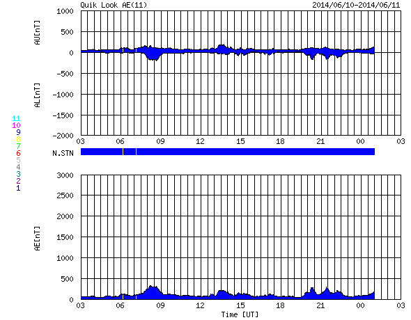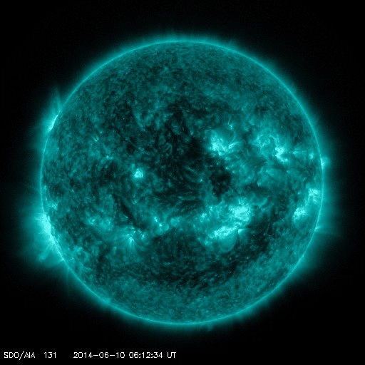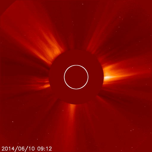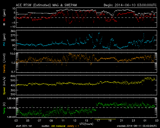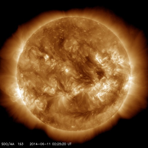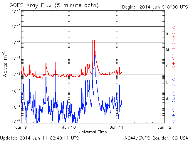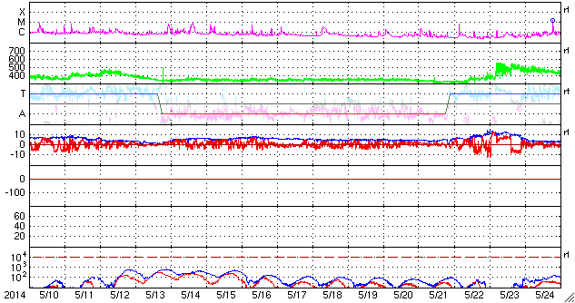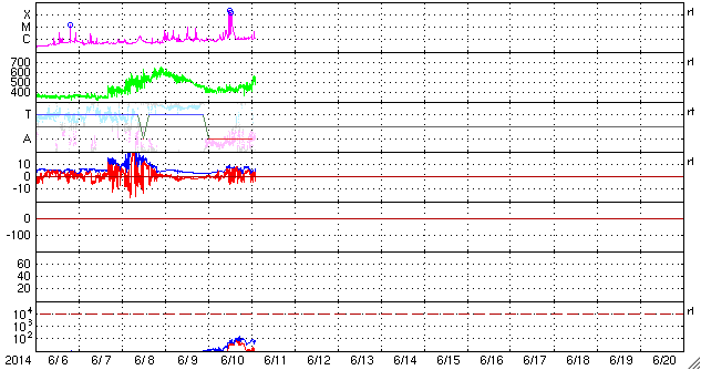 2014/ 6/11 11:42 更新 太陽の東端で、Xクラスの大規模フレアが2回発生しました。 担当 篠原 昨夜、太陽の東端から現れたばかりの2087黒点群で、 10日20時半(世界時10日11時半)にX2.2、 10日21時半(世界時10日12時半)にX1.5と、 Xクラスの大規模フレアが続いて2回発生しました。 SDO衛星AIA193による動画を掲載します。 太陽の端で激しい爆発が発生しています。 Xクラスのフレアは、4月25日のX1.3以来、1ヶ月半ぶりです。 このフレアを起こした2087黒点群の拡大写真を掲載します。 この黒点群の今後の活動に注目して下さい。 また、GOES衛星のX線写真では、 2085群や、太陽の中央部のやや左上でも小さい活動が起きています。 X線のグラフはにぎわってきています。 Xフレアに伴って、CME(太陽ガスの放出現象)も発生して、 太陽の左側に向かって激しくガスが噴き出しています。 SOHO衛星LASCO C2、C3の動画を掲載します。 噴出の中心は、地球からは横方向ですが、 地球方向へもある程度向かっている可能性があります。 明日の夜以降に、太陽風の弱い乱れが到来するかもしれません。 太陽風は、今朝くらいから速度が上がって、 520km/秒と高速風に戻っています。 磁場強度も、3〜8nTの範囲で変化しています。 磁場の南北成分は比較的北寄りで、 磁気圏では小さい変動が時々見られる程度です。 現在は速度が高まっているため、 磁場が南向きに振れれば、 オーロラ活動が活発になりやすい状況です。