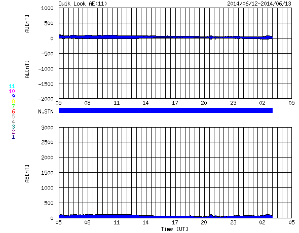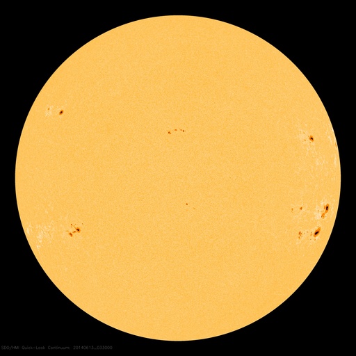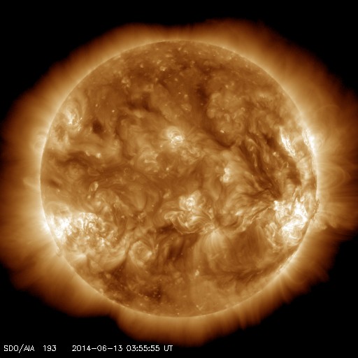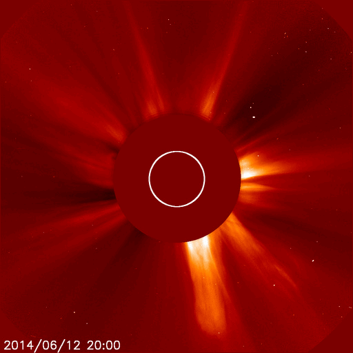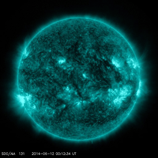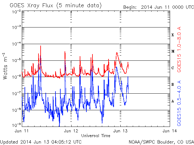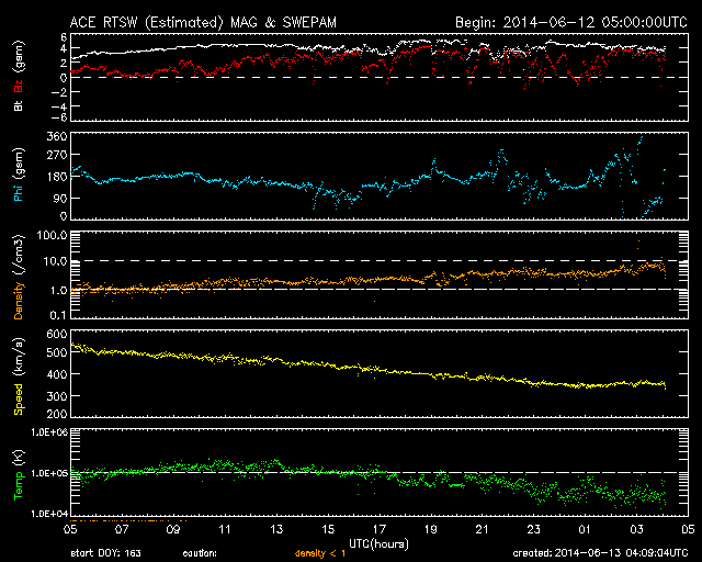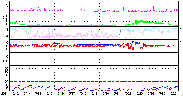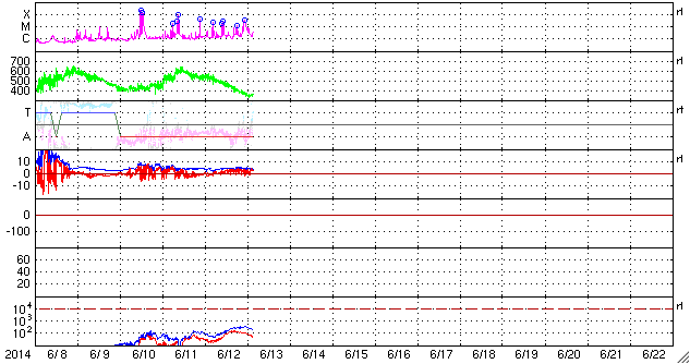 2014/ 6/13 13:09 更新 太陽は活発で、Mクラスフレアが7回発生しています。 担当 篠原 太陽のフレア活動は活発に続いています。 現在は、東の2087群だけでなく、 西の2085群、中央の2089群も活発で、 それぞれMクラスのフレアが発生しています。 昨日のニュース以降、2087群でM2.0、2085群でM1.8、 2087群でM2.7、M1.3、2089群でM1.1、 2087群でM1.0、2085群でM3.1と Mクラスのフレアは7回に達しています。 この他にも、Cクラスのフレアが10回近く発生しています。 活発な太陽の様子を、SDO衛星AIA131の動画でご覧下さい。 太陽のあちこちで明るい輝きが発生しています。 最後のM3.1フレアに伴って、太陽の南西(右下)に向かって CME(太陽ガスの放出現象)が噴き出しています。 SOHO衛星LASCO C2、C3の動画を掲載します。 まだ、発生して時間があまり経っていないため、 初めの頃の写真しかありません。 この動画の様子だと、 CMEは地球の方向へはほとんど向かっていないようです。 太陽風は、今朝にかけて更に速度が下がり続け、 350km/秒と一気に低速風に変わってしまいました。 現在はそのまま落ち着いています。 磁場強度は4〜5nTと平均的な状態です。 南北成分は北寄りに振れています。 このため、磁気圏は穏やかで、 AE指数はほとんど変化していません。 10日の夜に発生したCMEによる太陽風の乱れは、 まだ到来していません。 引き続き、太陽風の変化に注目して下さい。 ![]() 太陽のあちこちで活発にフレアが発生しています。SDO衛星AIA131。 (c) SDO (NASA)、 (動画加工 : 宇宙天気ニュース) ![]() M3.1のフレアに伴って、南西方向にCMEが噴出しています。SOHO衛星LASCO C2、C3。 (c) SOHO (ESA & NASA)、 (動画加工 : 宇宙天気ニュース) ![]() SDO衛星のAIA193カメラによる太陽コロナの様子 (c) SDO (NASA) ![]() SDO衛星による太陽の可視光写真。マウスの矢印を写真に重ねると、黒点番号付きの写真に切り替わります。 (c) SDO (NASA) ![]() GOES衛星の太陽X線データ (c) NOAA/SWPC ![]() ACEが観測した太陽風の磁場(1番上の枠、白線は全体の強度、赤線は南北成分) および、太陽風の密度(3番目の橙線)、速度(4番目の黄線) (c) NOAA/SWPC ![]() リアルタイムAE指数 下段のAEグラフの値が高くなると、オーロラ活動が活発化しています。 (c) 京都大学, NICT ![]() 27日の太陽周期に合わせたデータプロット 太陽が同じ面を地球に向けていた27日前の変化から、今後を予想することができます。 (c) 作図:宇宙天気ニュース