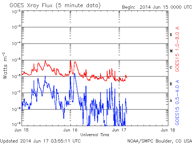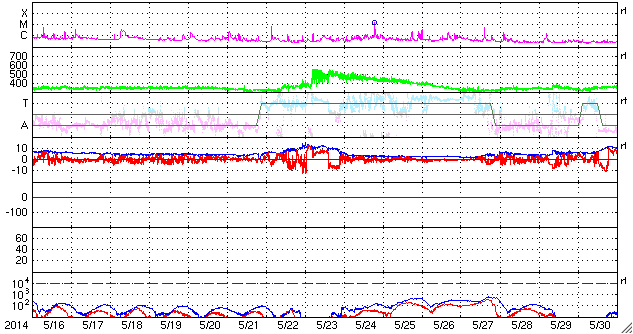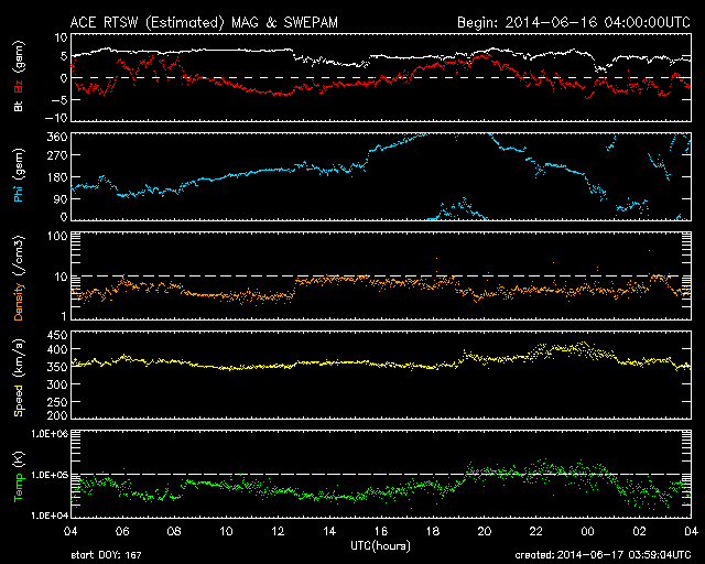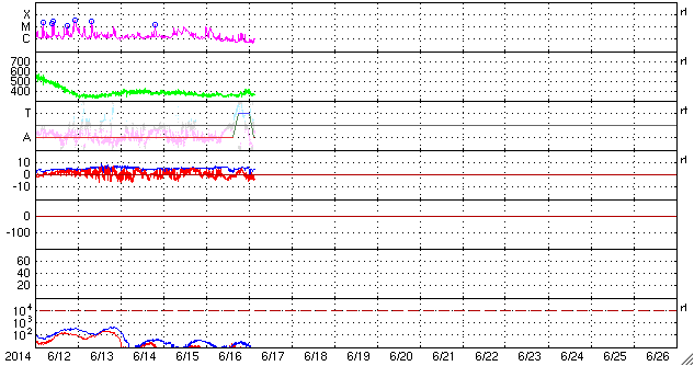 2014/ 6/16 12:59 Mクラスのフレアが2回発生しています。太陽風は低速で、磁気圏も穏やかです。