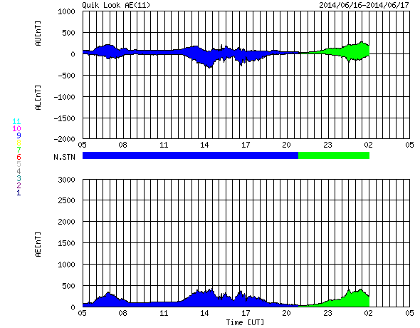 下段のAEグラフの値が高くなると、オーロラ活動が活発化しています。