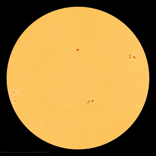 SDO衛星による太陽の可視光写真。マウスの矢印を写真に重ねると、黒点番号付きの写真に切り替わります。